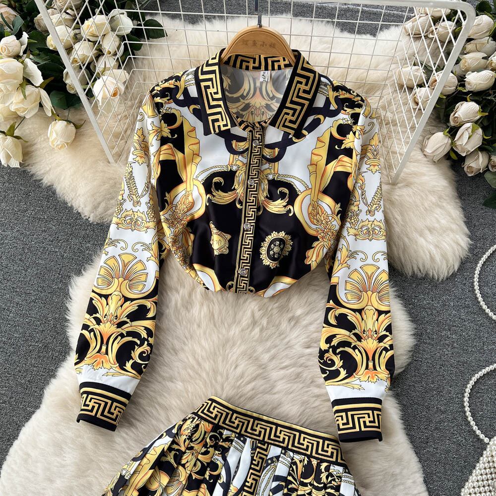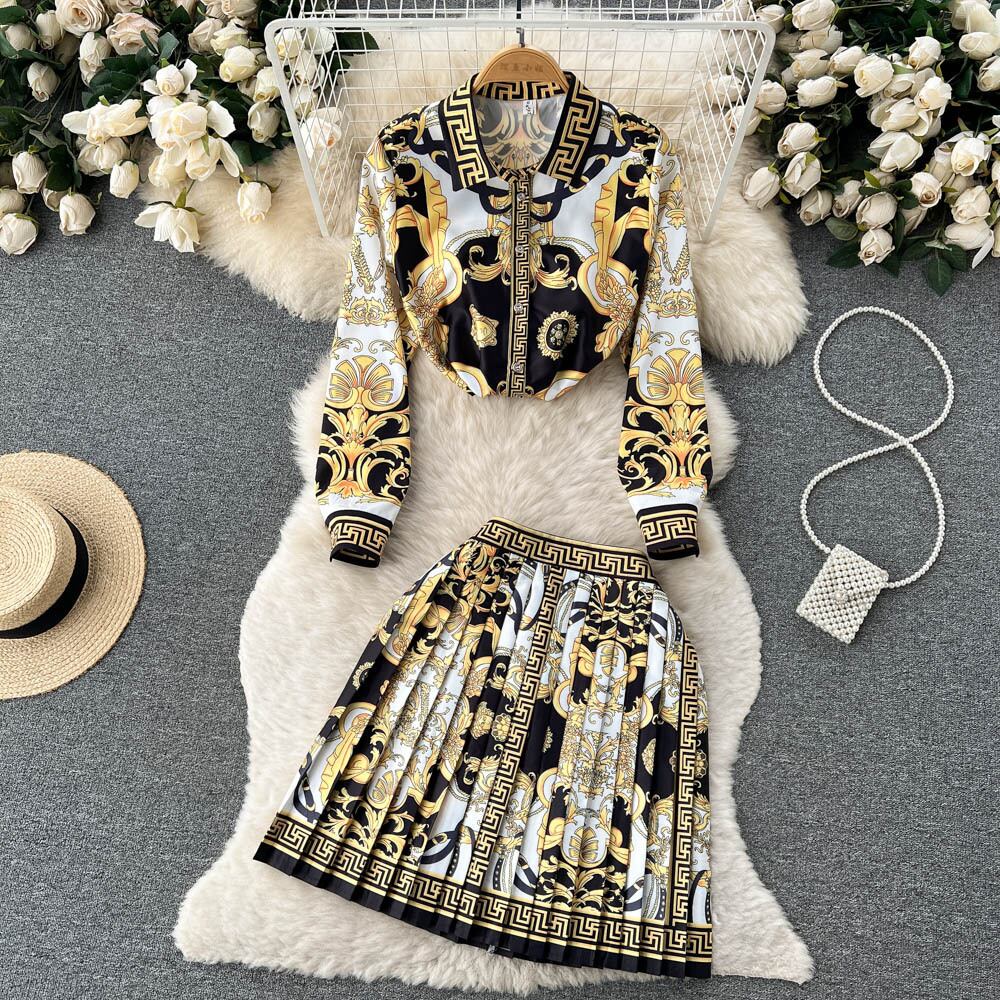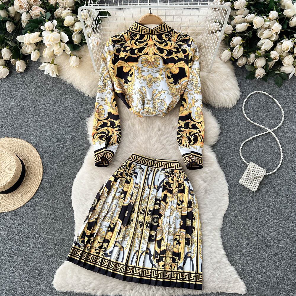 春秋の新作コートスタイルプリントスーツ女性らしさラペルシャツ+プリーツスカートスカートツーピーストレンディ スプリング 春物 オータム 秋物 lyxaj82782423922