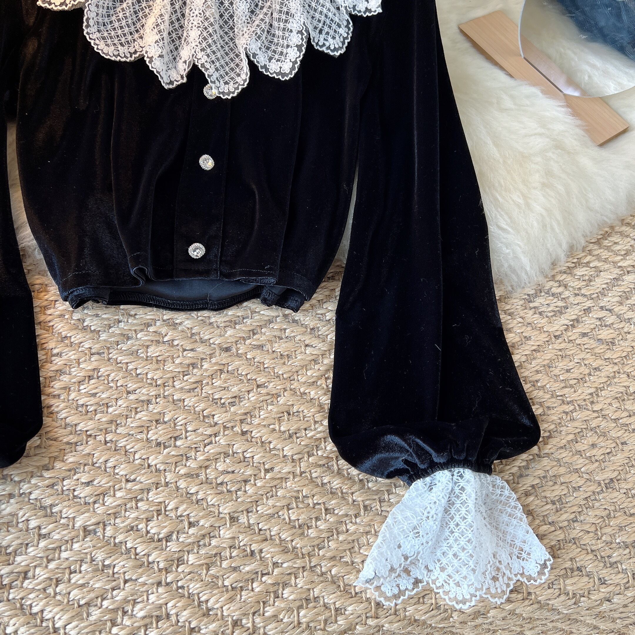 2022 秋の新レースステッチスクエアカラーベルベットトップ女性のデザインセンスニッチショートオールマッチシャツ オータム 秋物 スクウェア lyxaj86881090331