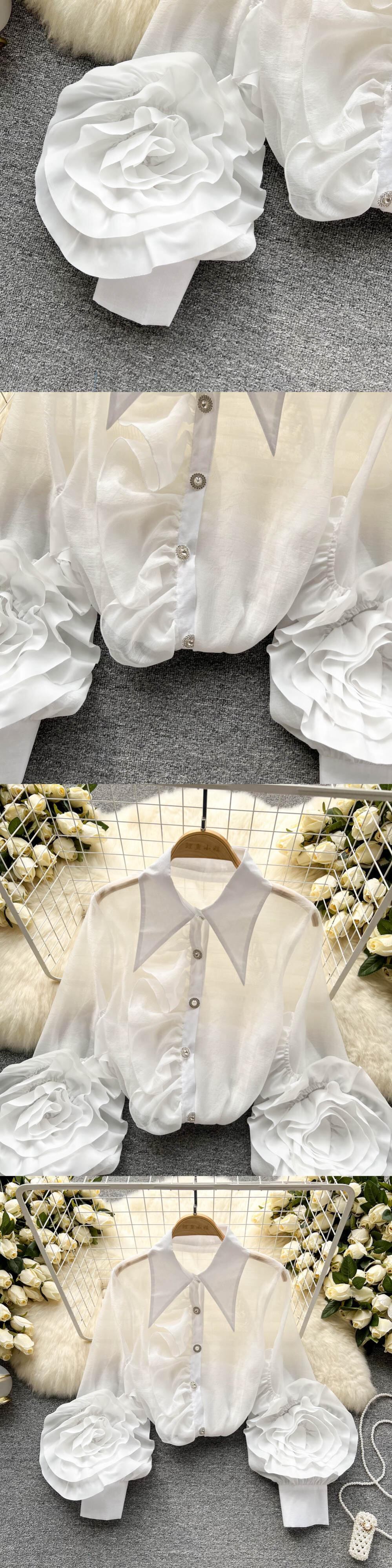 立体花柄長袖シャツレディースデザインセンスニッチゆったり気質万能ポロ襟シングルブレスト薄手トップス ロング フラワーデザイン lyxaj53433989481