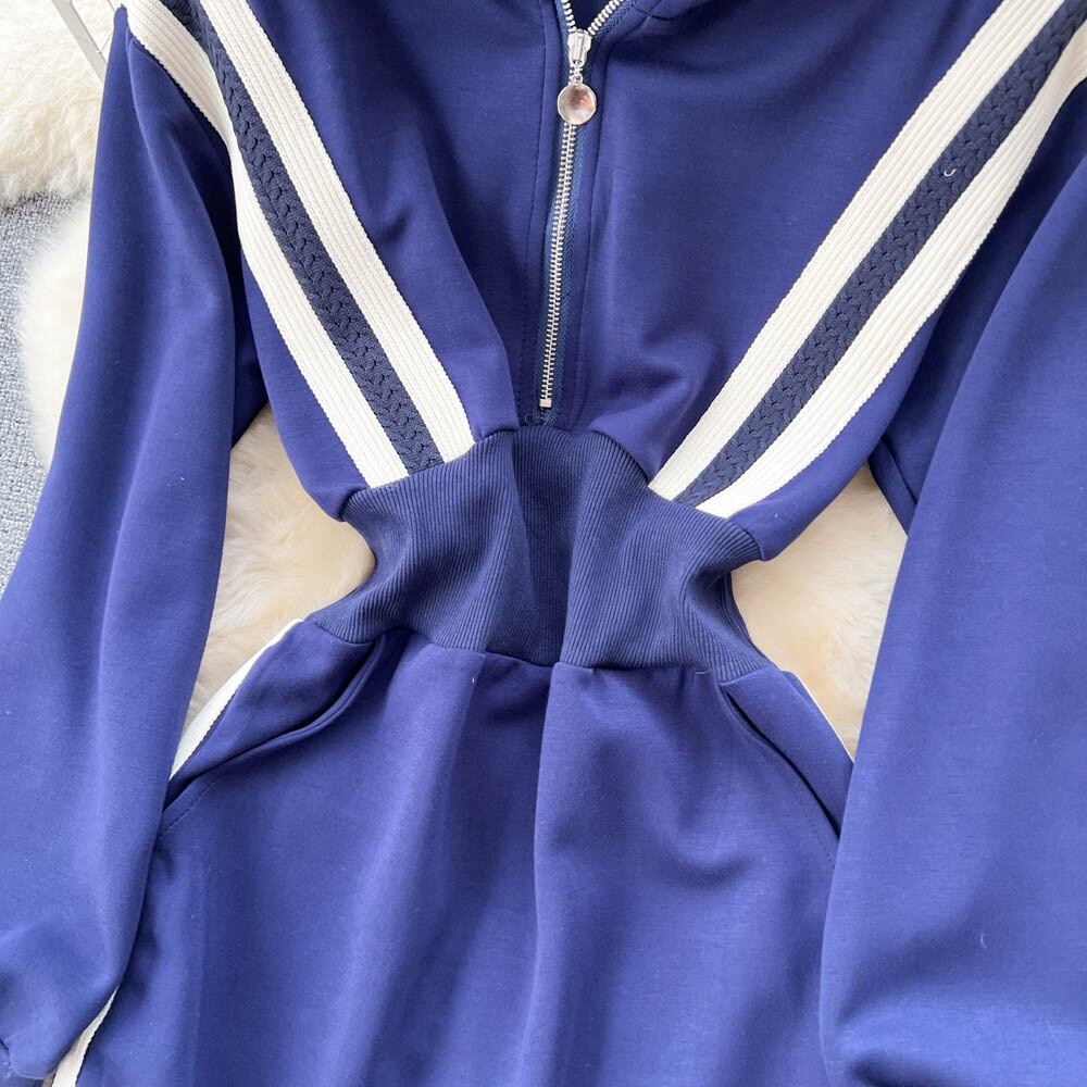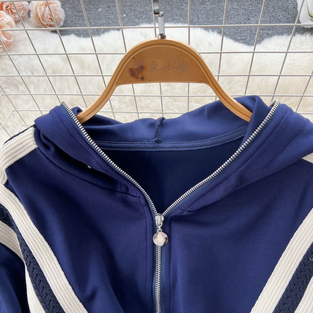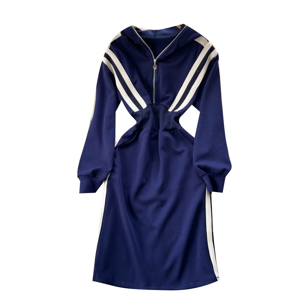 2022 秋ジッパーニッチデザインセンスフェイクツーピースカラーマッチングニットストライプウエストセーターフード付きドレス女性 オータム 秋物 lyxaj99605932847