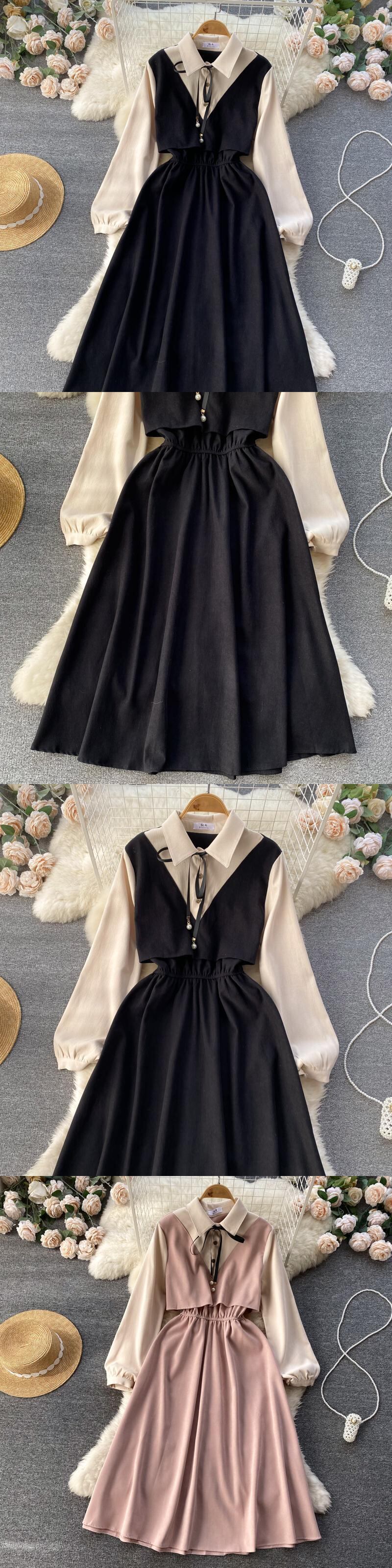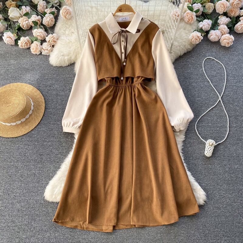 フェイク ツーピース シャツ ドレス レディース フレンチ ヘップバーン カレッジ スタイル ポロ カラー マッチング カラー マッチング ウエスト ビッグ スイング 膝上 ロング スカート lyxaj3731635172