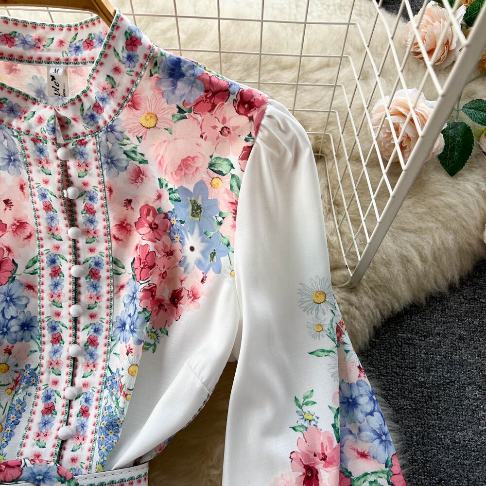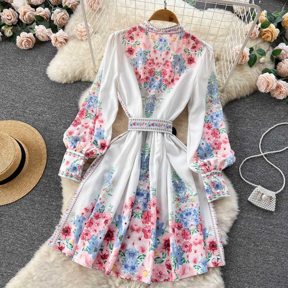 春と秋のレトロなエスニック スタイル スタンド カラー シングルブレスト ランタン スリーブ ウエスト スリム ドレス スウィート プリーツ フェアリー スカート ランタンスリーブ 大人ガーリー キュート カジュアル スプリング 春物 オータム 秋物 lyxaj53025018841