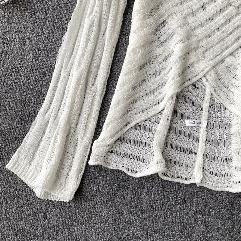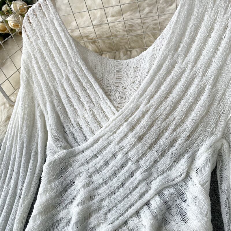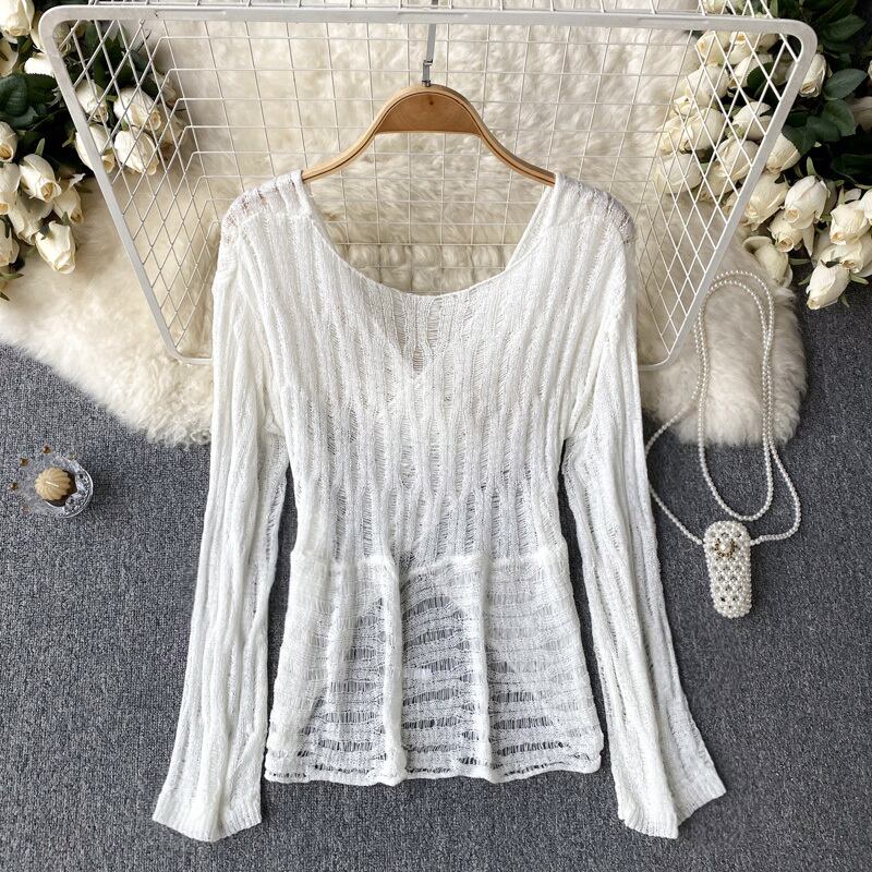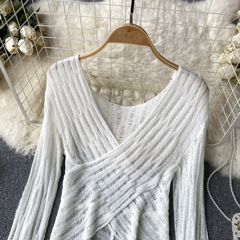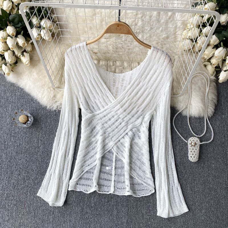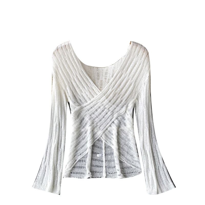 春夏新デザイン感覚 ショートクロス Vネック 鎖骨 シック ニット 日焼け止め トップス レディース 薄手 長袖 Tシャツ トレンド ロング スプリング 春物 サマー 夏物 lyxaj35324942227