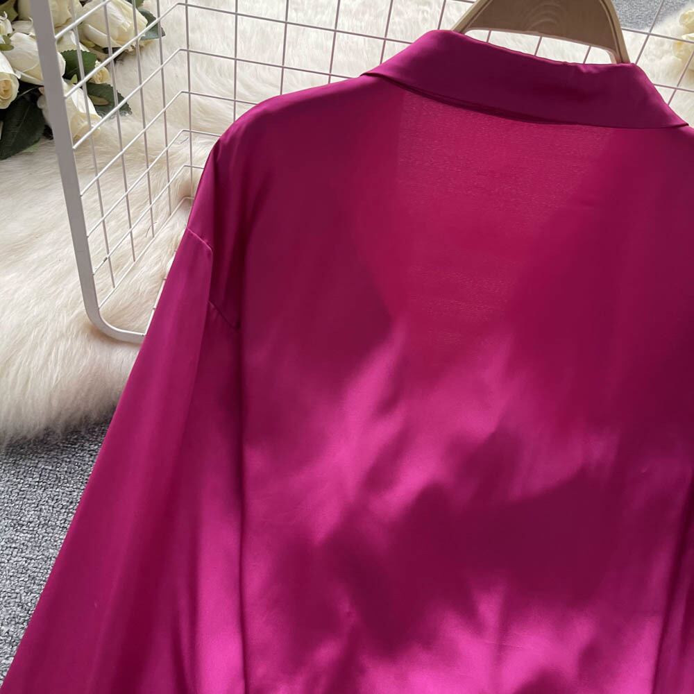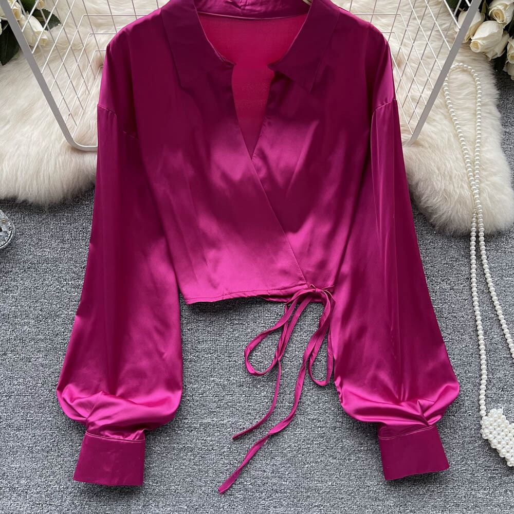 春秋の新ファッションウエスト痩身フレンチVネックオールマッチサテンシャツレディースタイアップショートレトロトップ スプリング 春物 オータム 秋物 lyxaj60792812103