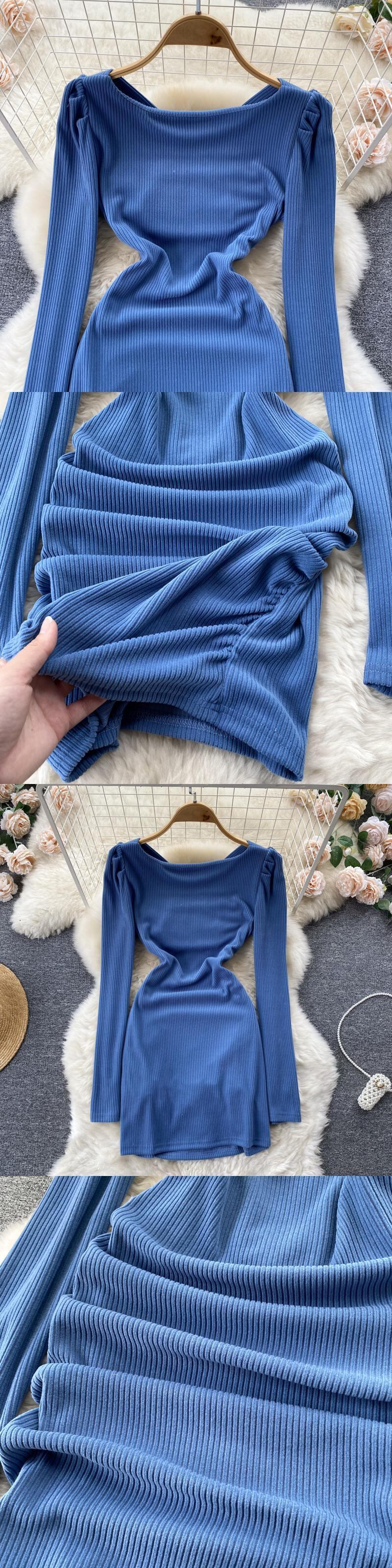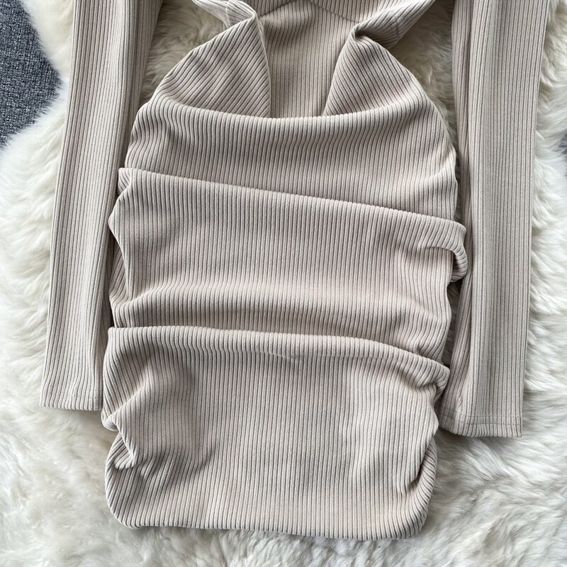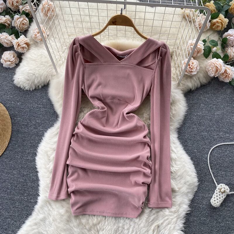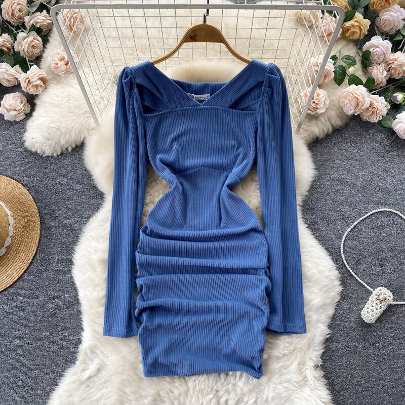 秋と冬の新しい純粋な欲望の計画中空 V ネックのデザインのセクシーなしわのお尻気質ニット ドレス オータム 秋物 ウィンター 冬物 Vネック ピュア lyxaj11051038876