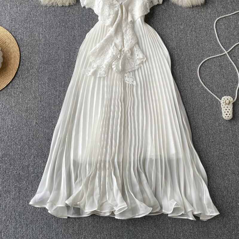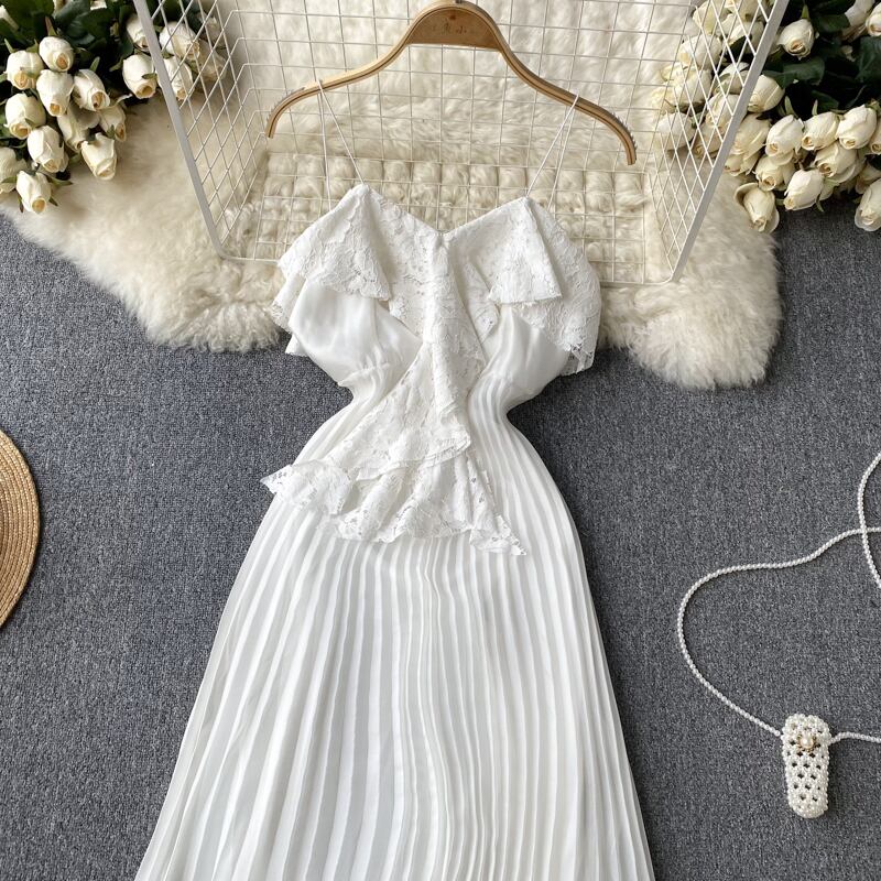 夏の妖精のスリング ドレス女性ウエスト痩身穏やかな風甘いレース ステッチ ビッグ スイング プリーツ ロング スカート 大人ガーリー スウィート キュート カジュアル サマー 夏物 lyxaj64844917814