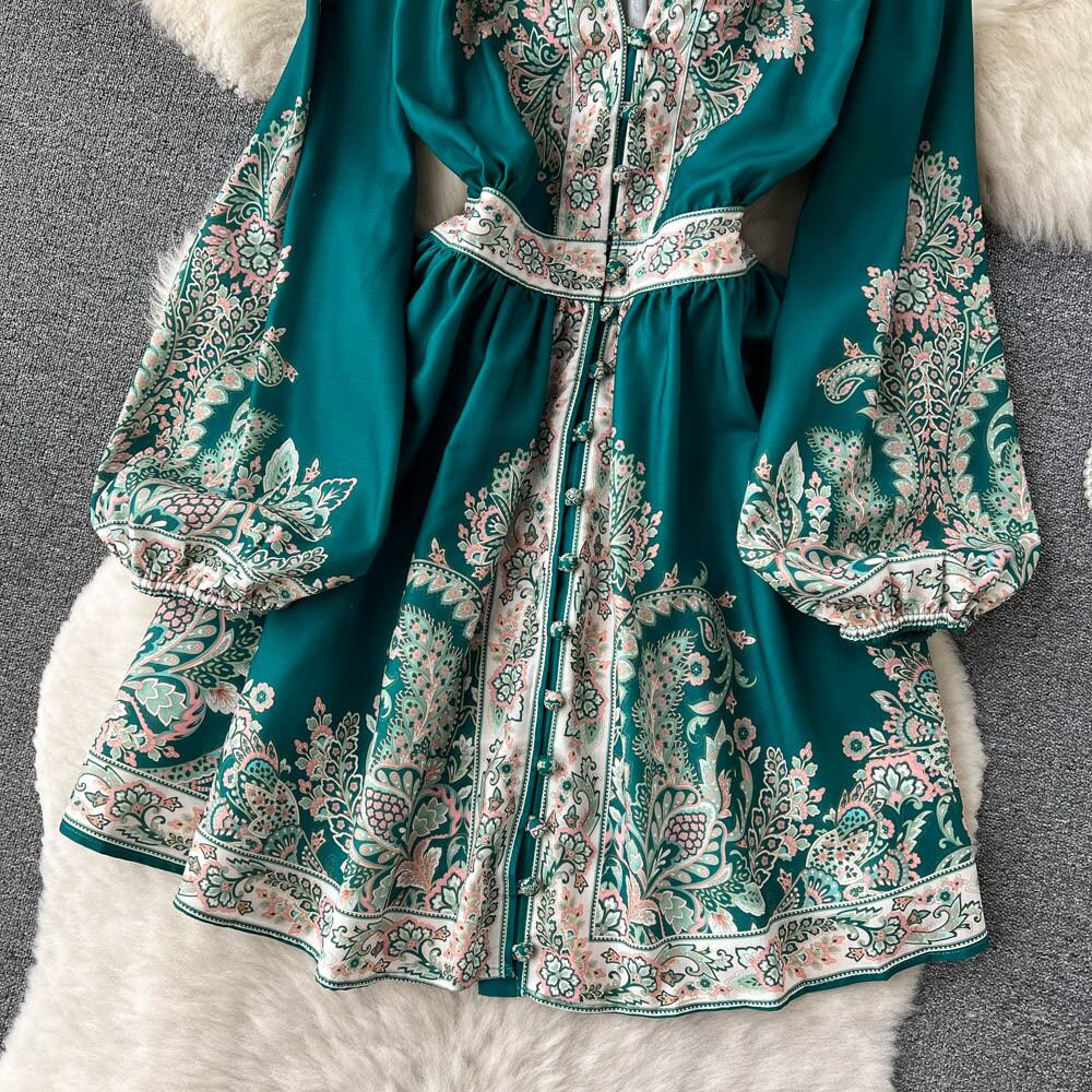 春と秋の新しい休日の宮殿スタイル V ネック ランタン スリーブ シングル ブレスト ボタン ウエスト痩身 A ライン プリンセス ドレス ランタンスリーブ レース スプリング 春物 オータム 秋物 Vネック Aライン lyxaj83763685247