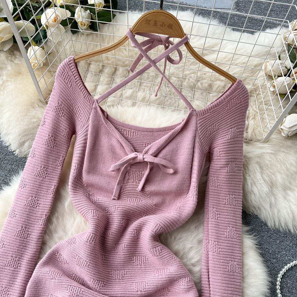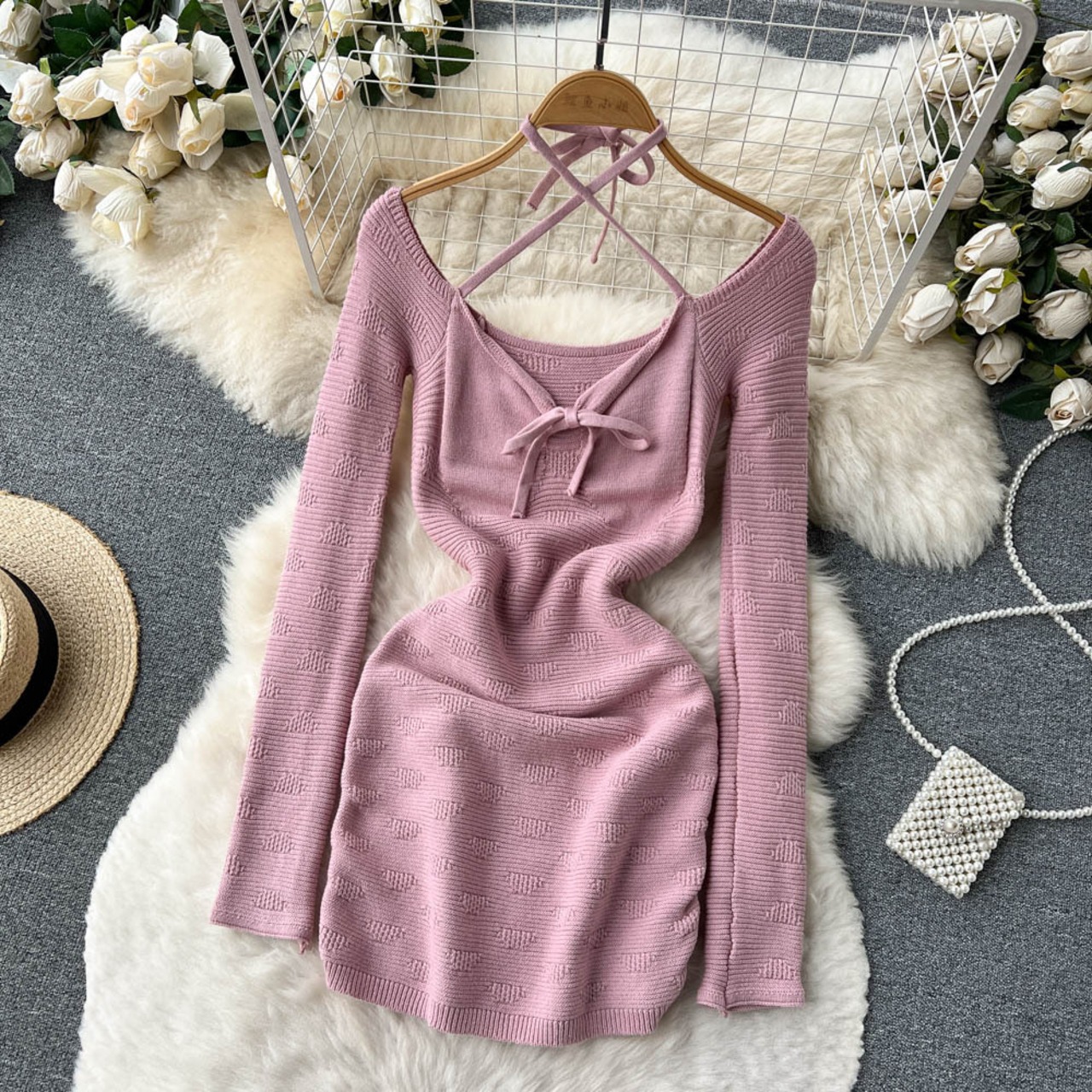 春と秋のニッチな甘くてスパイシーなスタイルの純粋な欲望吊り下げネックストラップレスニット長袖ドレスセクシーなシャーリングバッグヒップスカート女性 ロング 大人ガーリー スウィート キュート カジュアル スプリング 春物 オータム 秋物 ピュア lyxaj94208630653
