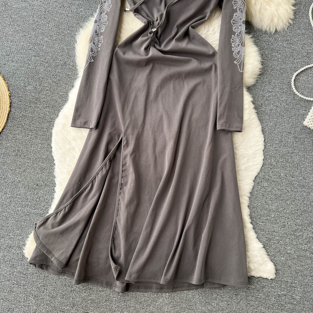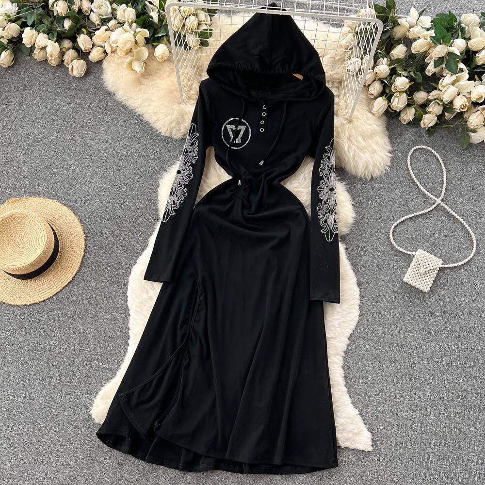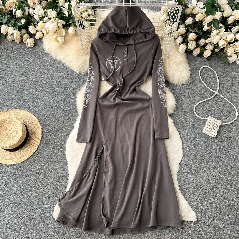フレンチウエストプリント長袖ドレス秋の女性の高品質怠惰な風フード付きスリットバッグヒップドレス ロング オータム 秋物 lyxaj2400053664