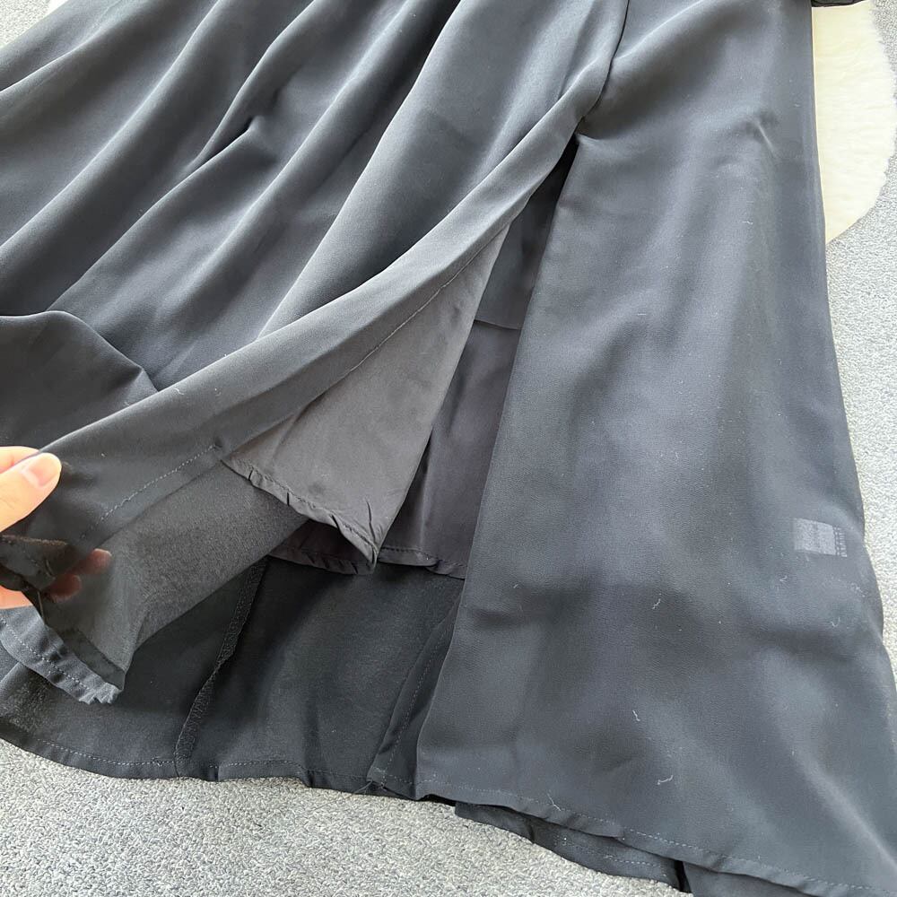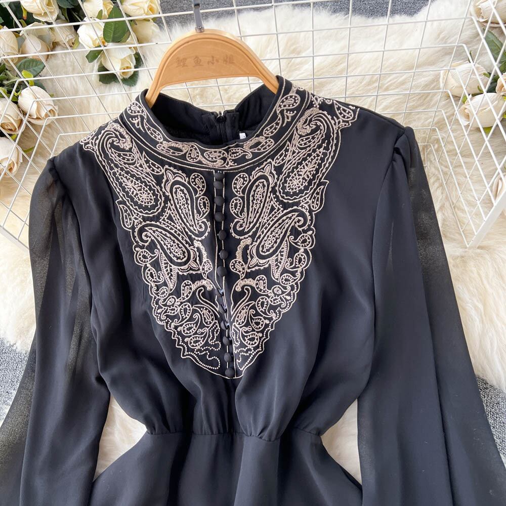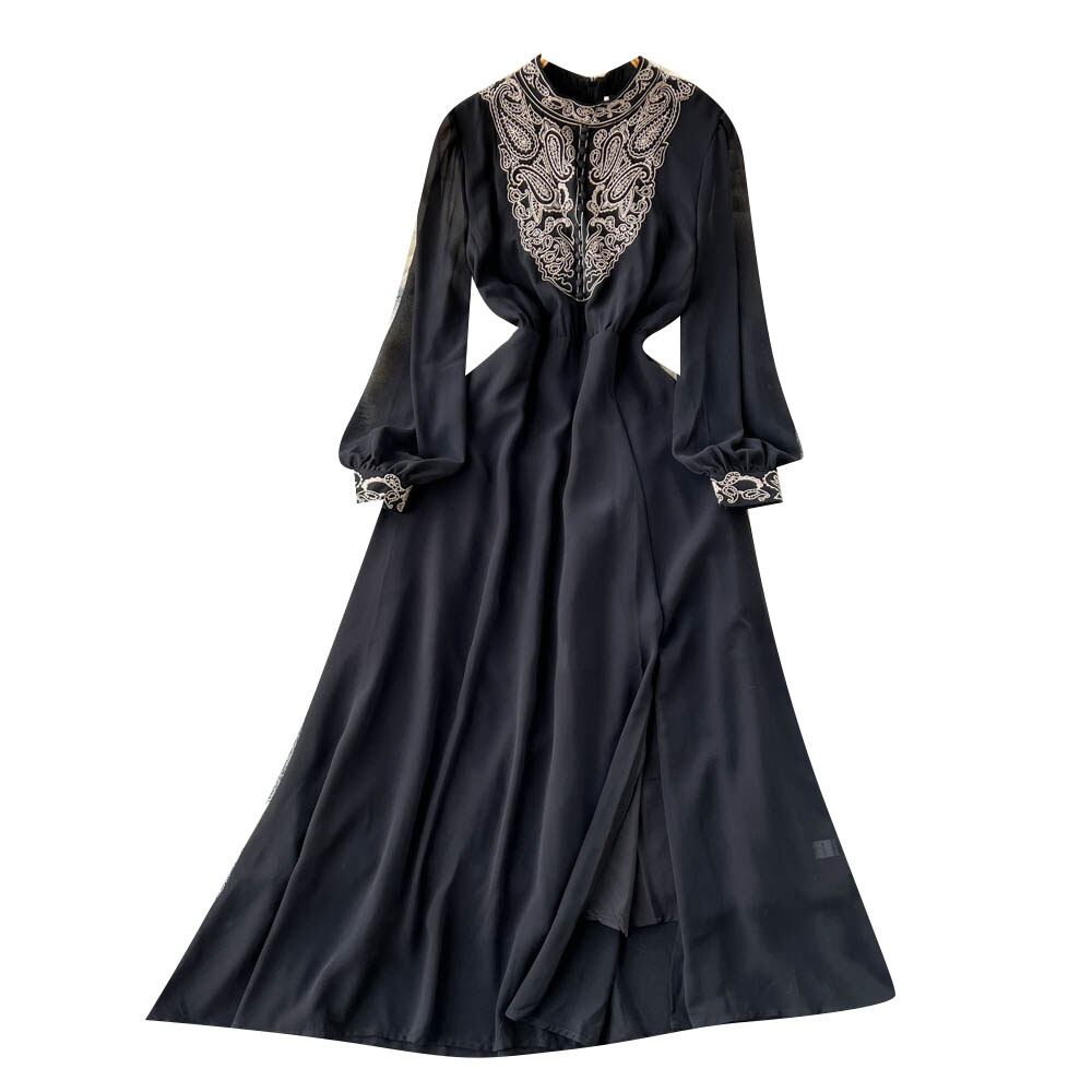 春と秋のブロンズ刺繍ラウンドネックパフスリーブメッシュロングドレス気質ウエストスリムスリットスイングドレス スプリング 春物 オータム 秋物 Oネック lyxaj5318145149