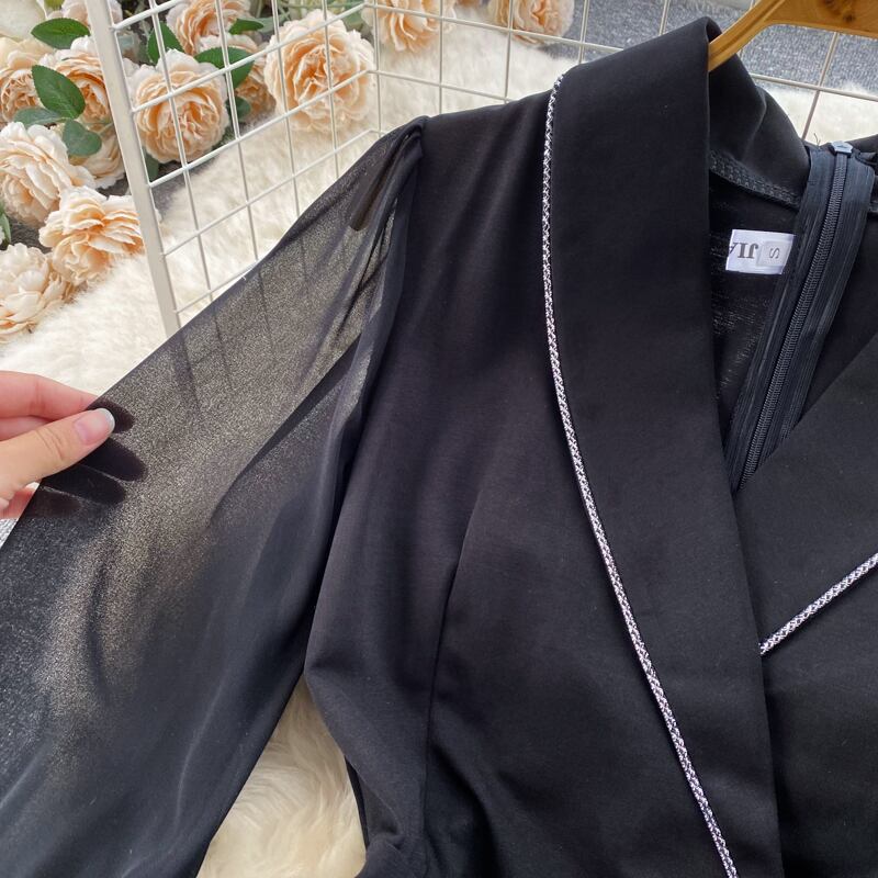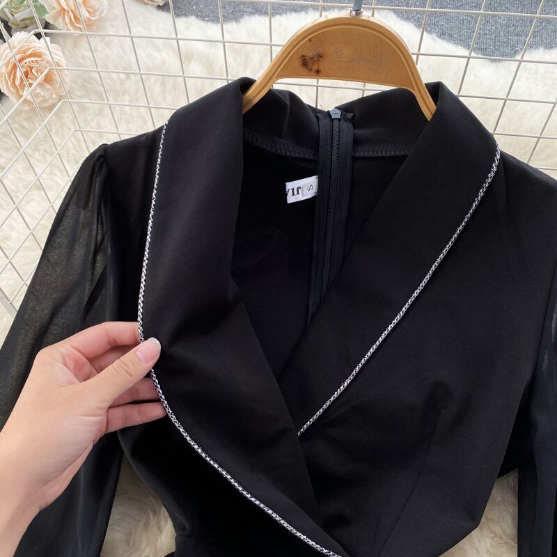 秋と冬の軽やかで馴染みのあるスタイルのハイエンドレトロラペルパフスリーブウエストスリットメッシュステッチバッグヒップスリットドレス オータム 秋物 ウィンター 冬物 lyxaj99415355198