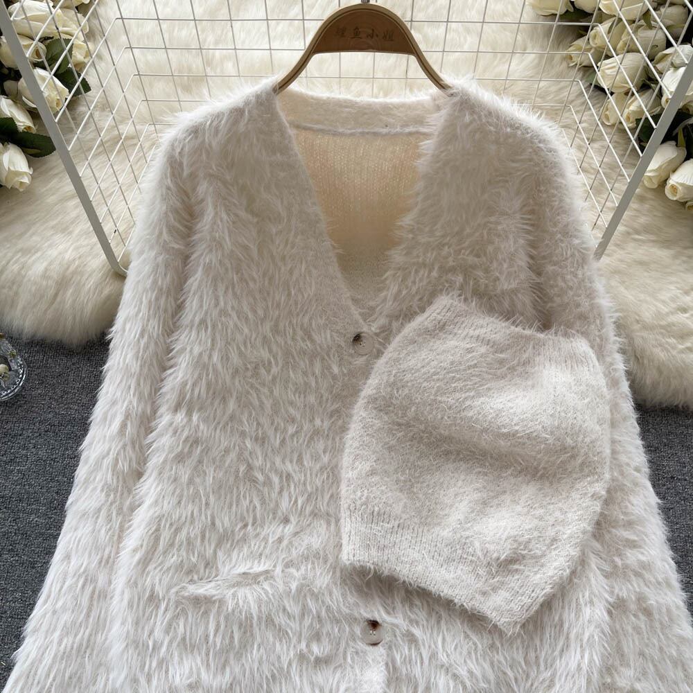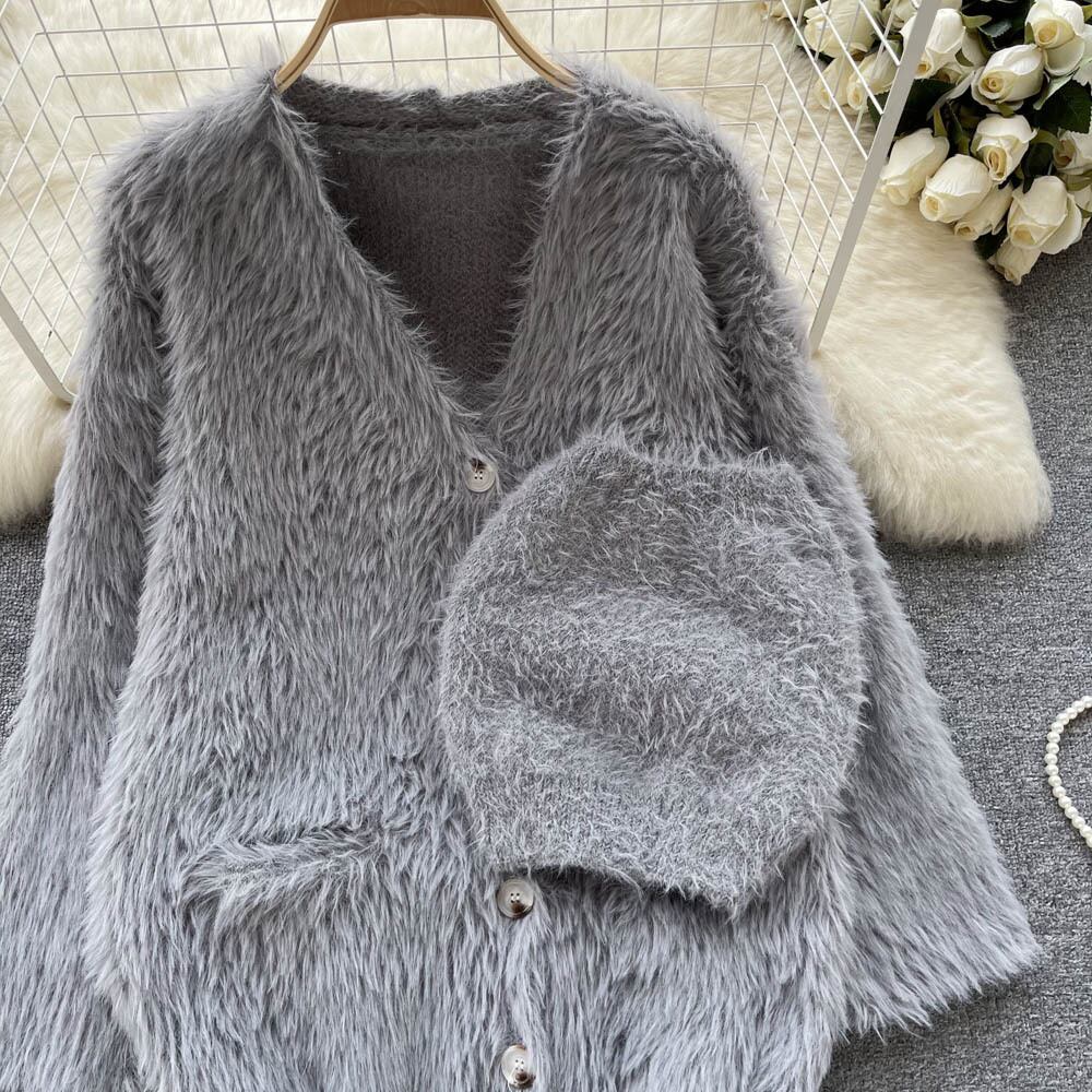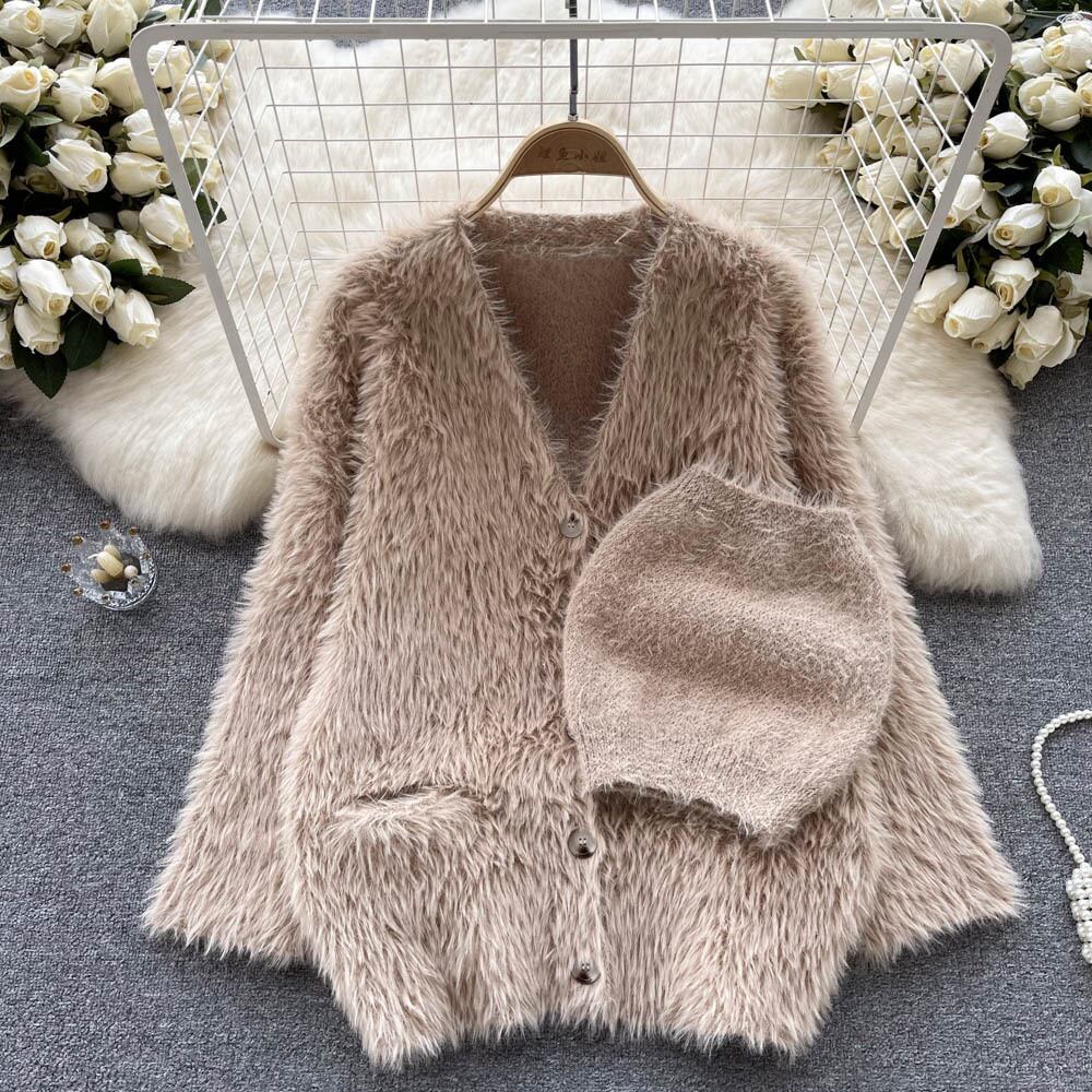 インスタイルのバージョンのイミテーションミンクぬいぐるみニットカーディガン女性Vネックシングルブレストルーズセーターショールコートチューブトップ付き lyxaj65890777132
