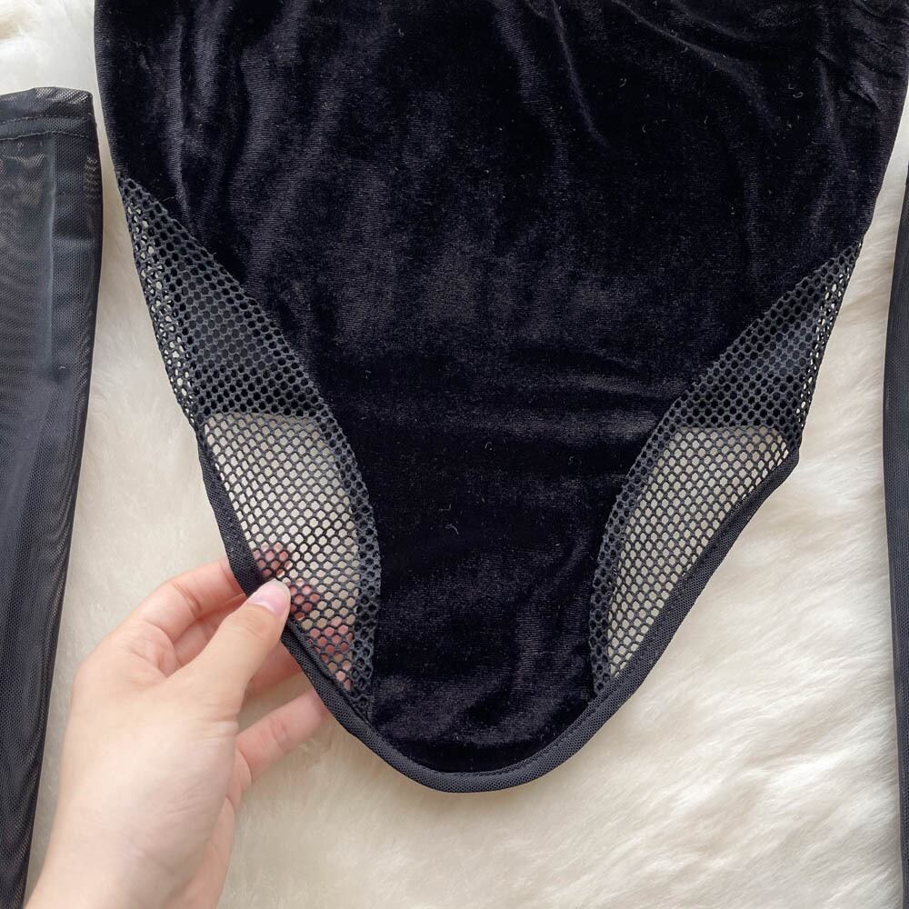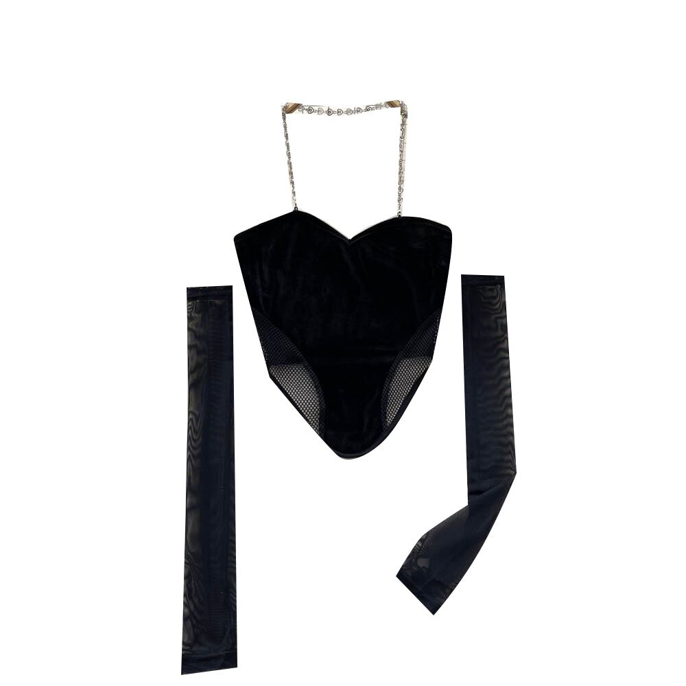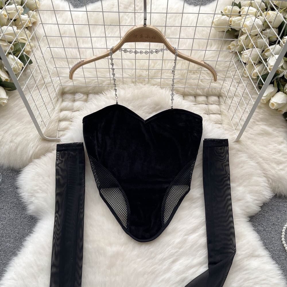 センス チェーン ハンギングネック イレギュラー オフショルダー スプライシング メッシュ ホローベルベット ボトムス Tシャツ トップス レディース 袖付き lyxaj25020099865