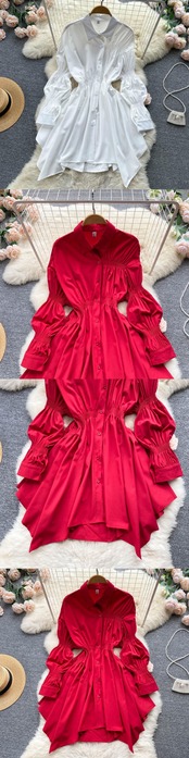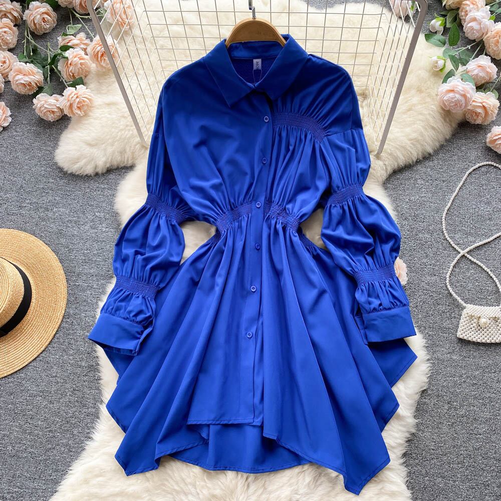 不規則なシャツの女性の長袖 2022 秋の新しいスタイルのウエストウエスト気質ラペルシングルブレストボタンショートオールマッチドレス ロング オータム 秋物 lyxaj5539035316