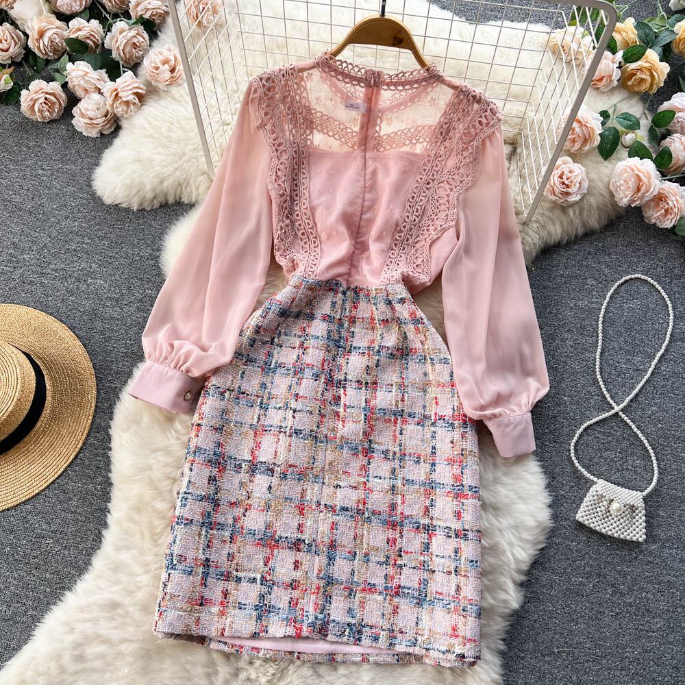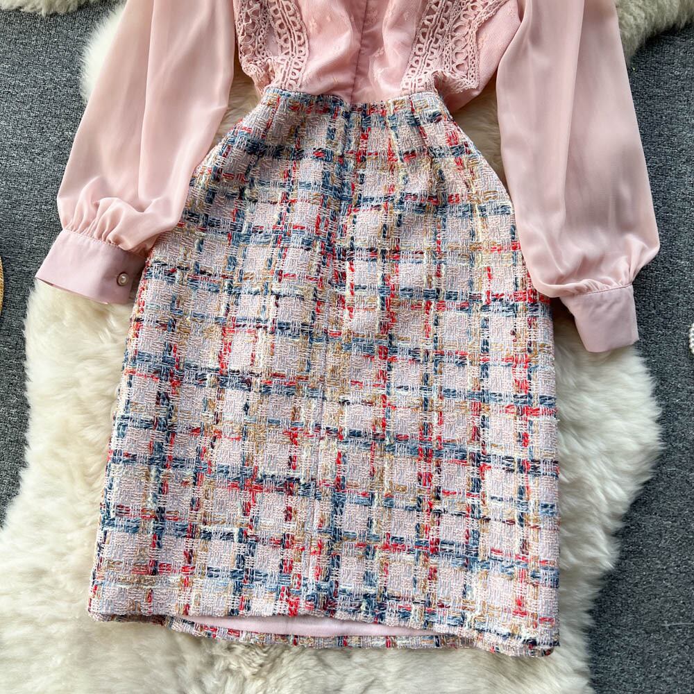 2022 秋の新重工業メッシュ刺繍ステッチ中丈ツイード小さな香り風バッグヒップ A ラインドレス オータム 秋物 Aライン lyxaj61682156863