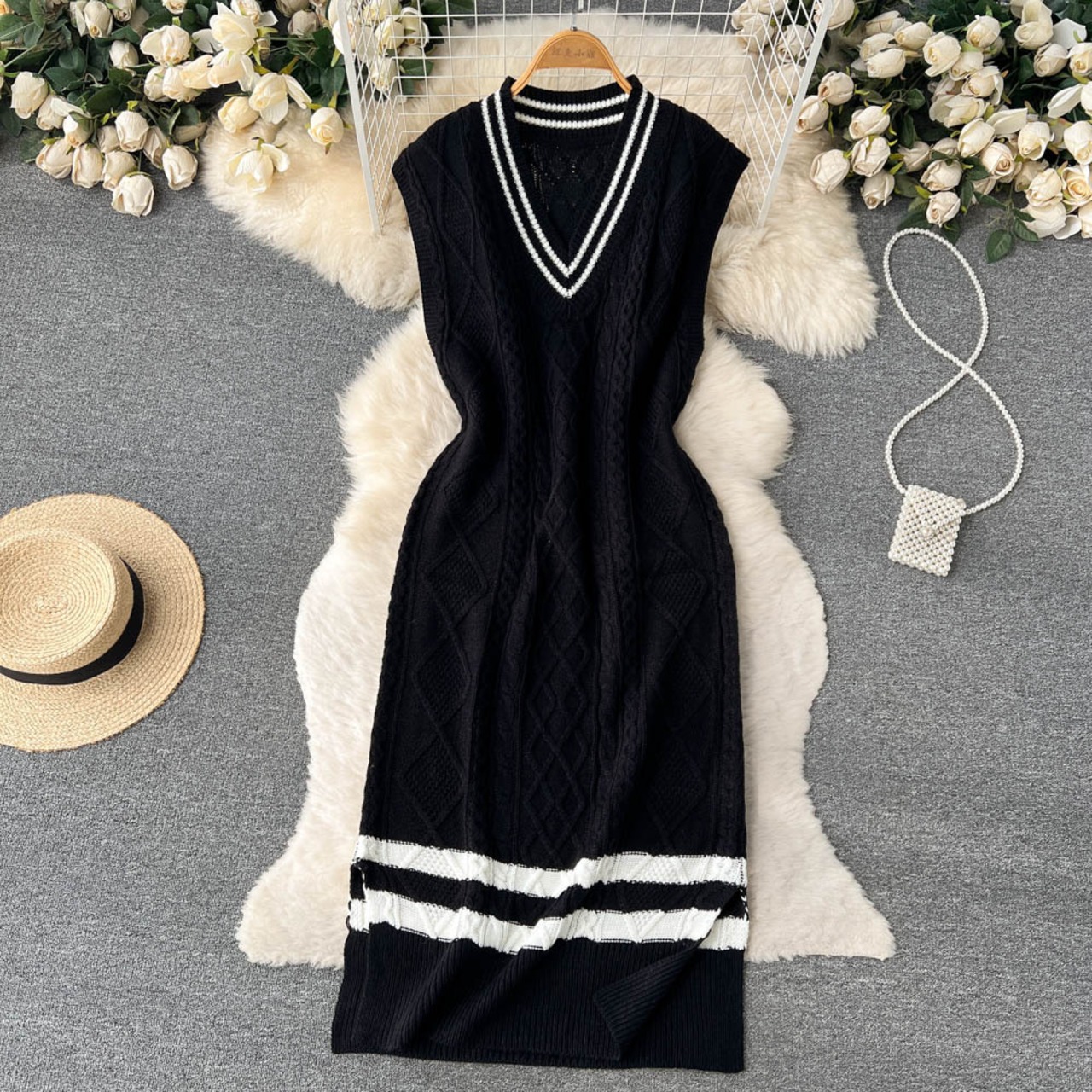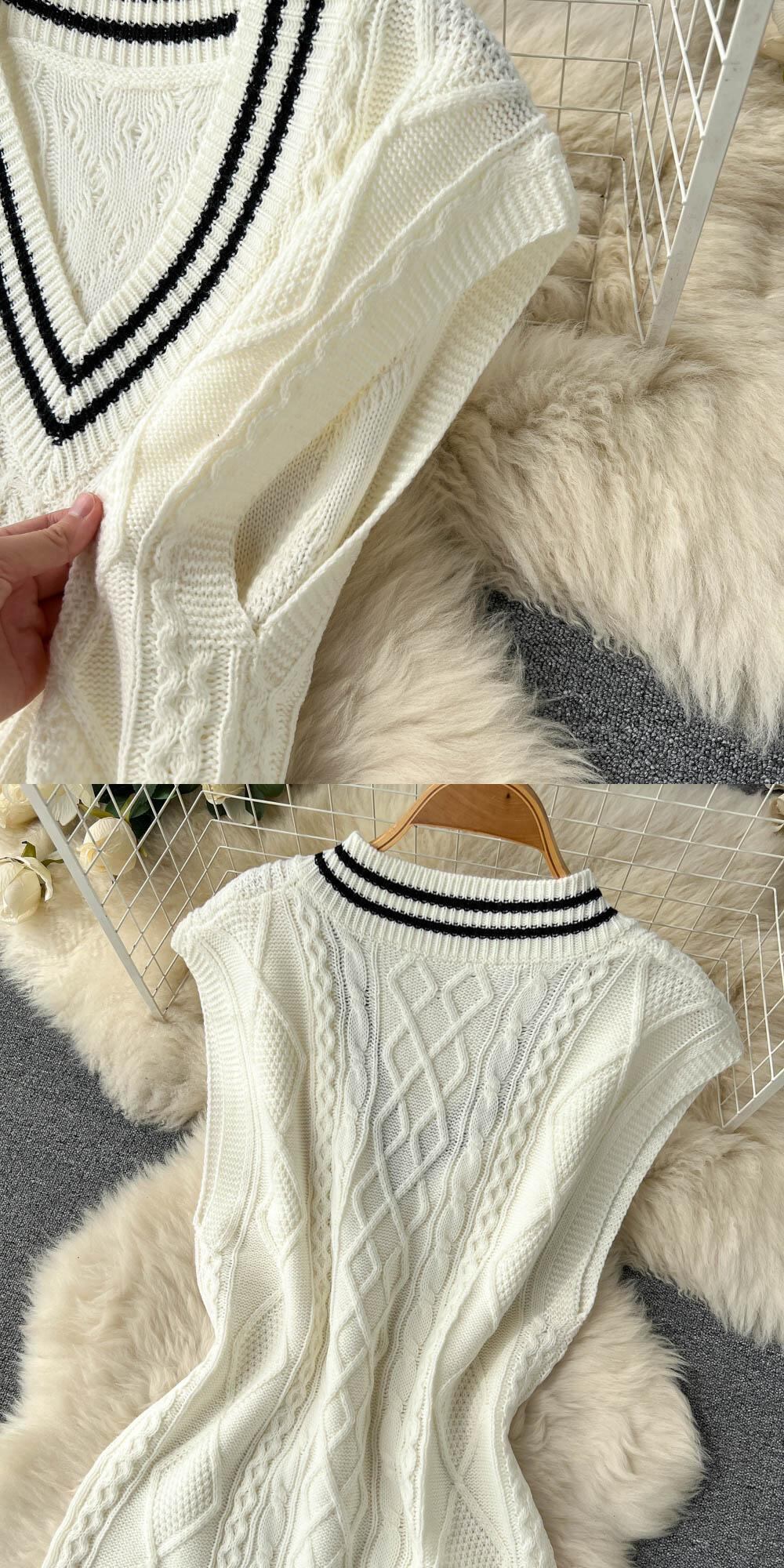 style カラー コントラスト Vネック レトロ風 ゆったり アウター ツイストセーター ノースリーブ スリット バッグ ヒップワンピース lyxaj62168308111