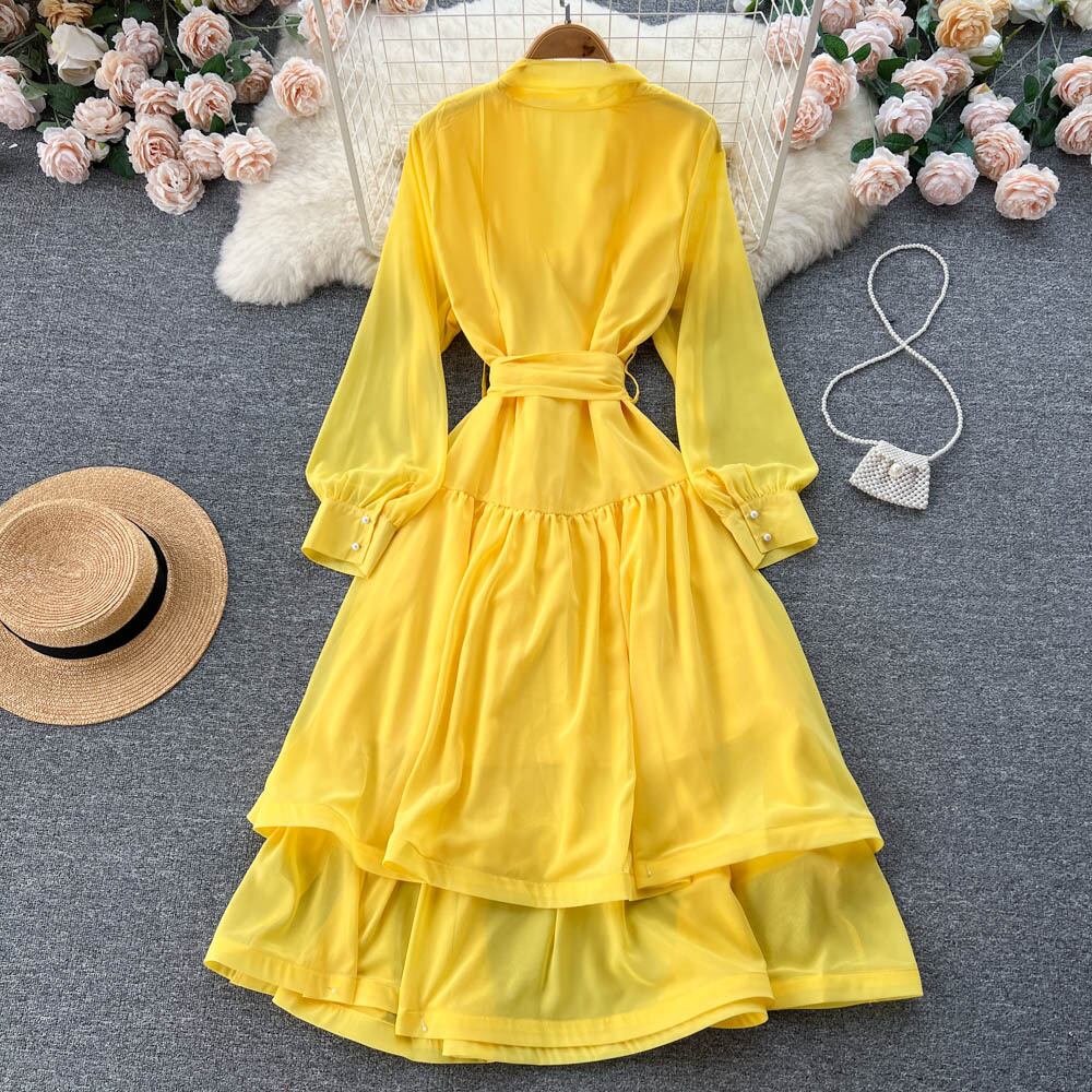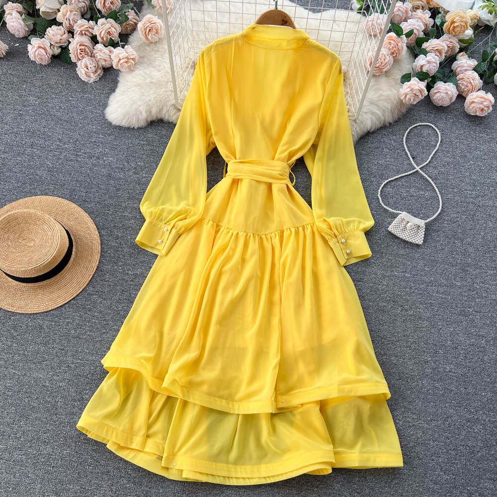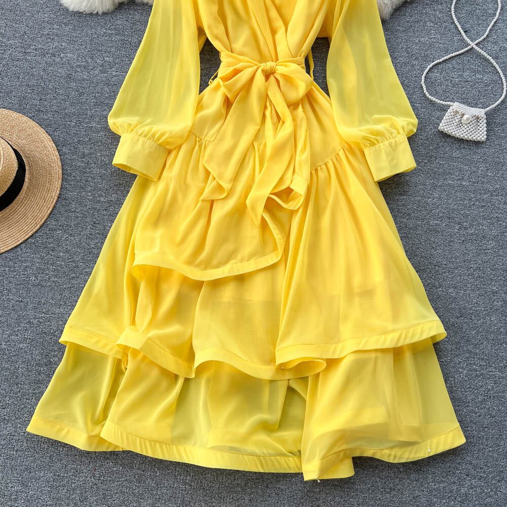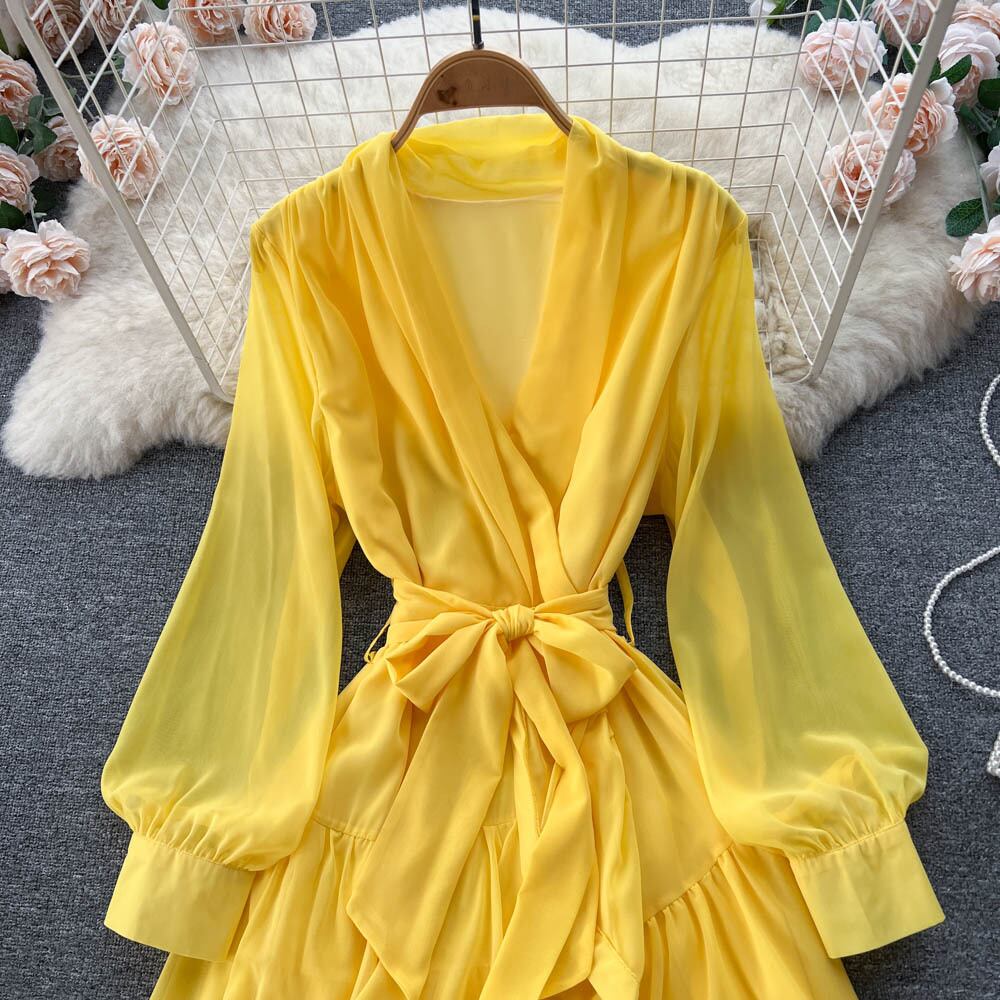 -エンドニッチデザインタイアップちょう結びランタンスリーブドレス秋の女性のウエスト痩身Vネックドレス リボン オータム 秋物 lyxaj4725076549