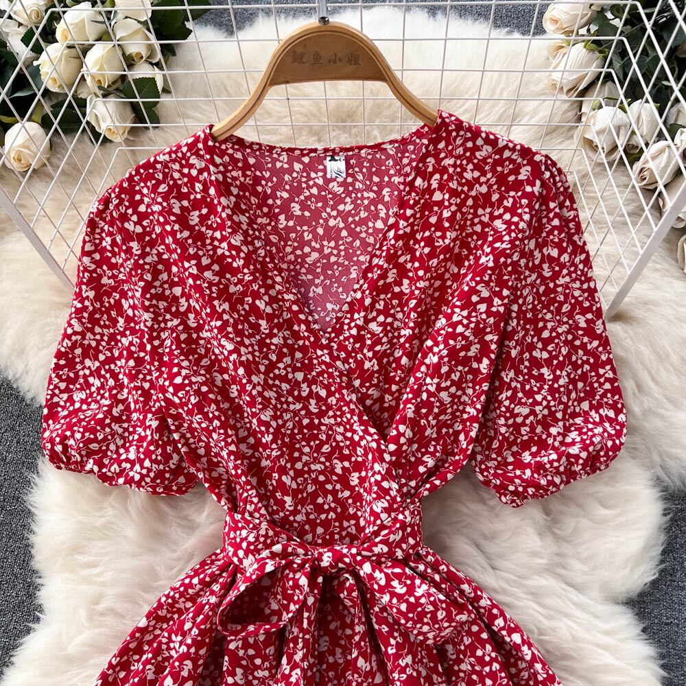 花柄のドレスの女性のレトロなワンピース ネクタイ ウエスト痩身気質 V ネック自己修養ショート ホリデー スカート トレンディ Vネック lyxaj84026157027