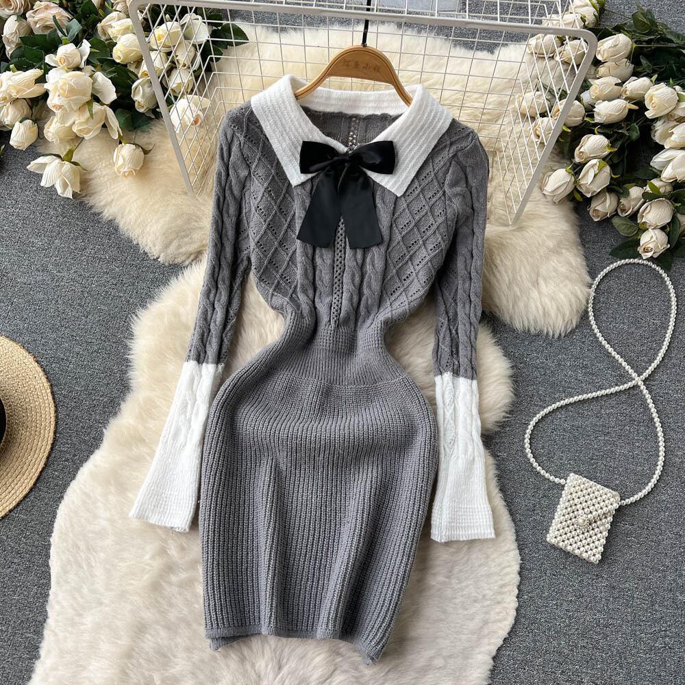 フレンチプレッピースタイルのニットドレスレディース秋冬ポロカラーコントラストカラーリボントランペットスリーブバッグヒップセータースカート オータム 秋物 ウィンター 冬物 lyxaj58940760878