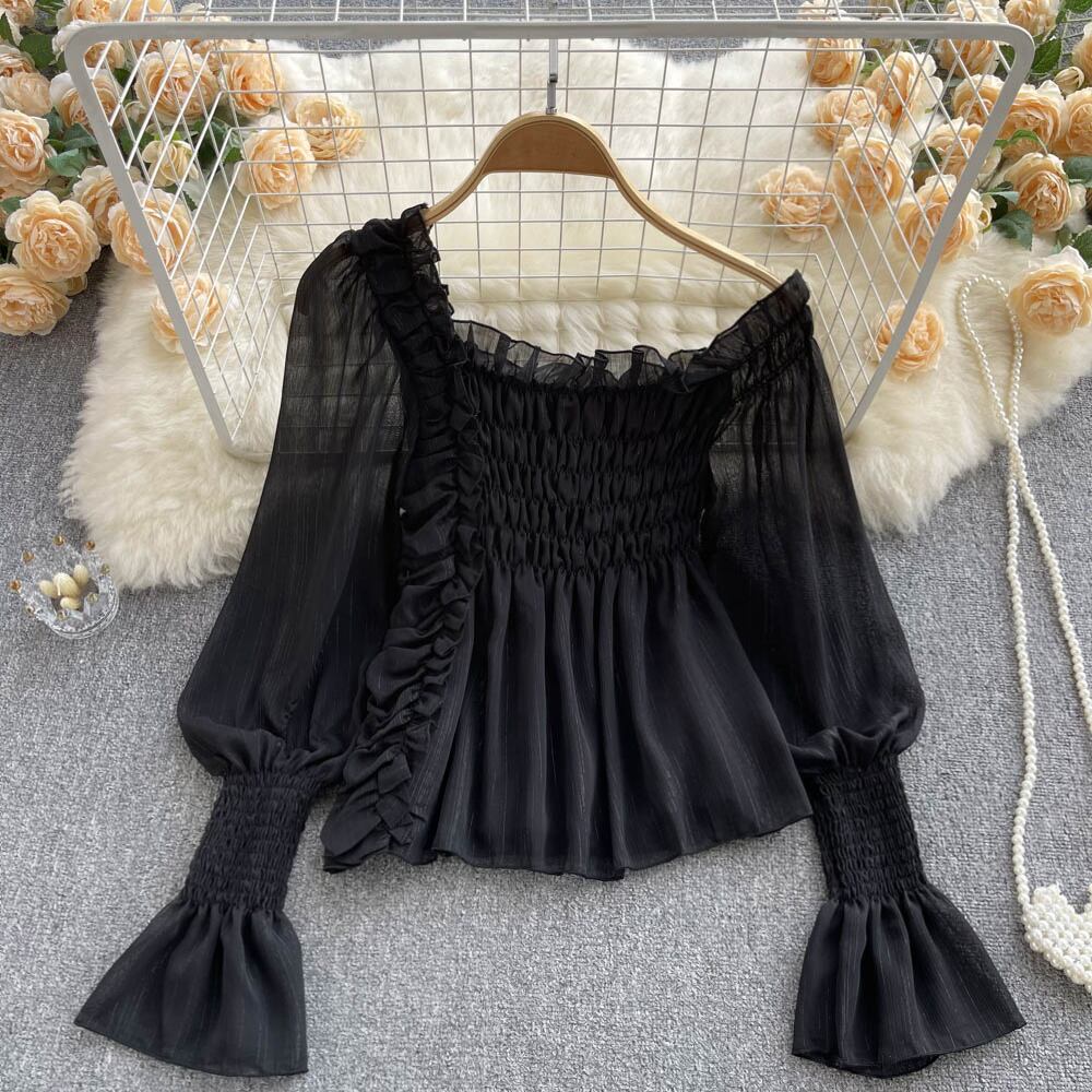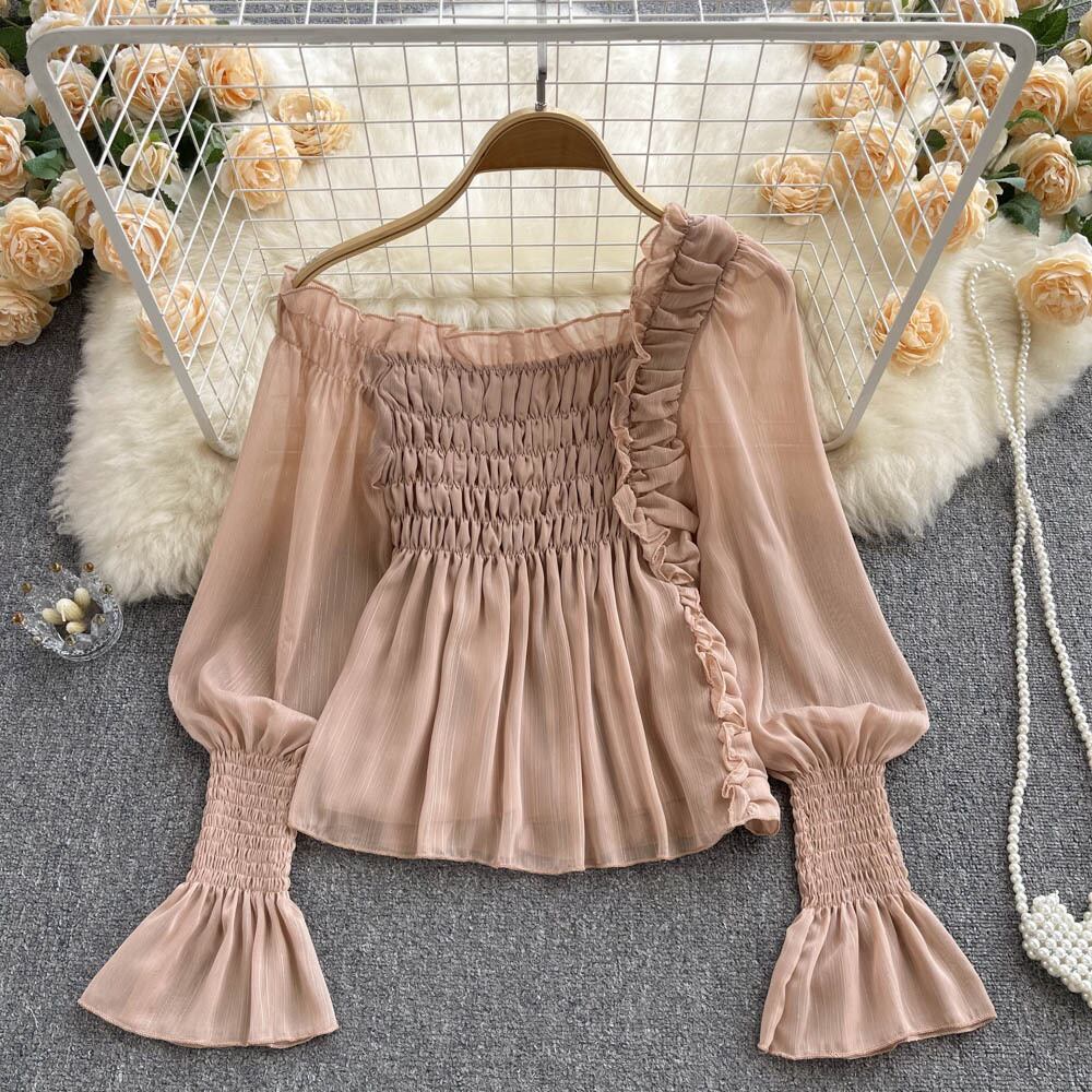 シフォンシャツ シックで綺麗な小さめシャツ ラッパスリーブ オフショルダーシャツ トップス 夏 レディース フレンチ 鎖骨折り 白シャツ ホワイト サマー 夏物 lyxaj96271294970
