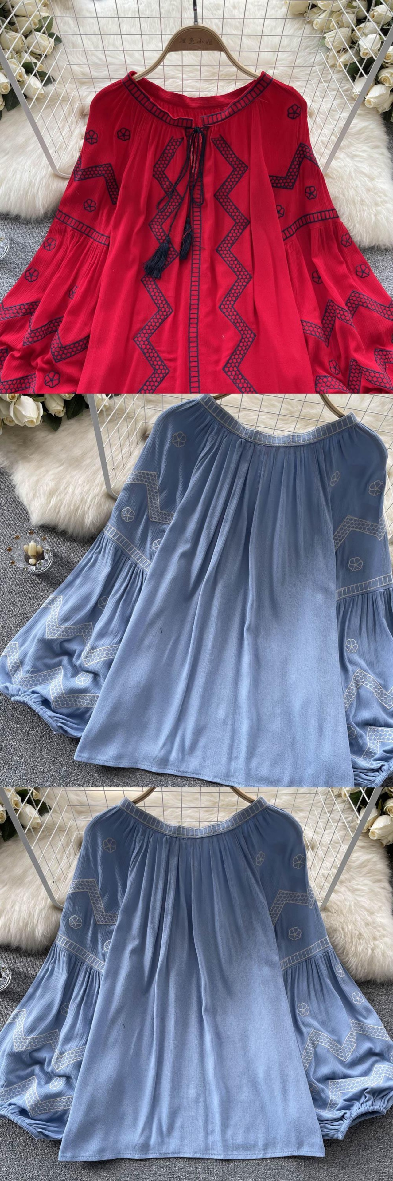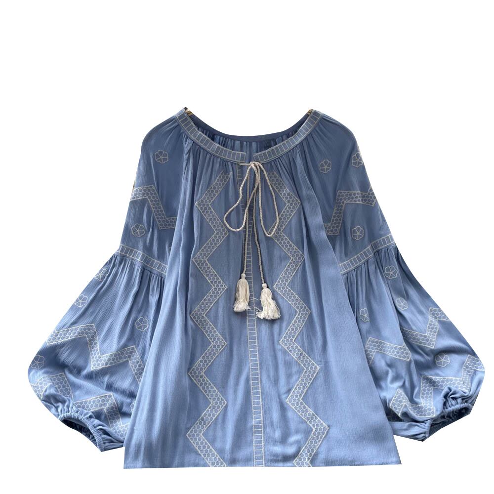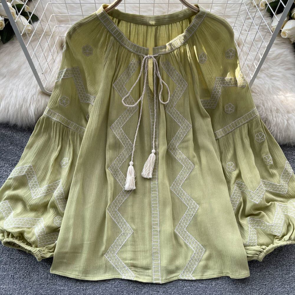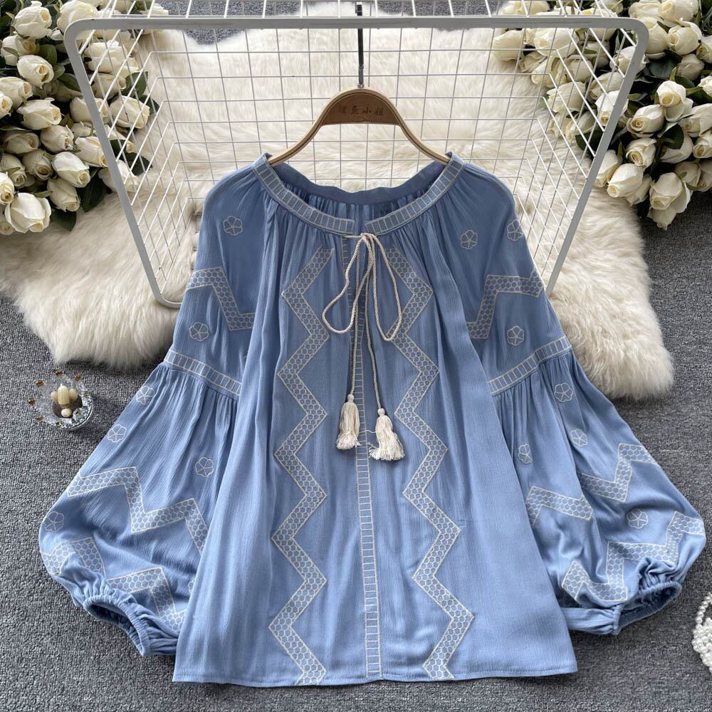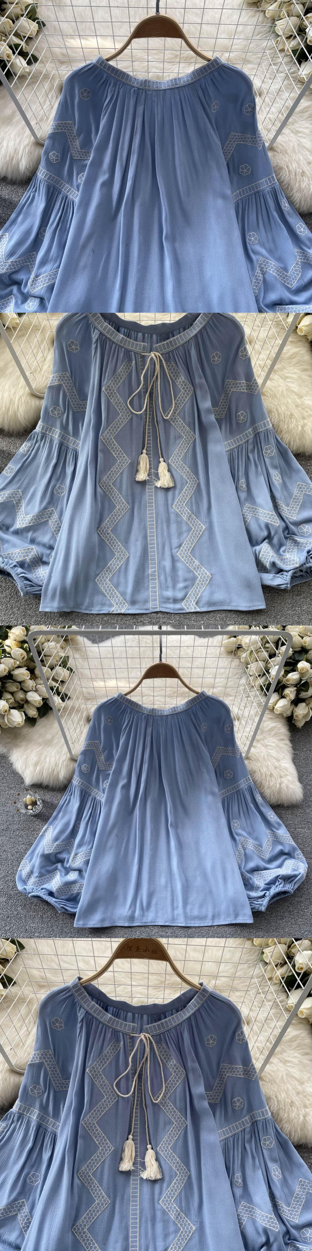 フランスのヨーロッパとアメリカのスタイルのプリントラウンドネックシャツの女性の春と秋のランタンの袖のデザインセンスニッチなルーズで薄い人形のシャツ ランタンスリーブ スプリング 春物 オータム 秋物 Oネック ヨーロピアン lyxaj52163672228