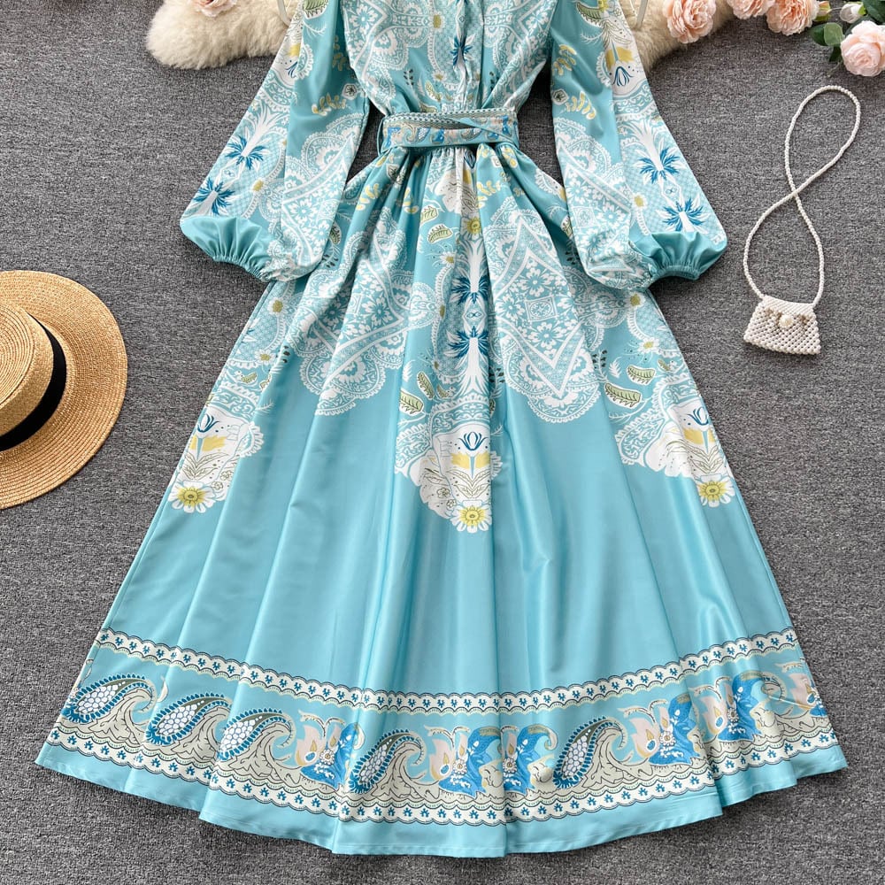 春の新しいホリデースタイルの気質デザインセンスVネック蝶ネクタイストラッププリント提灯スリーブウエストドレス ランタンスリーブ リボン スプリング 春物 lyxaj75017672441