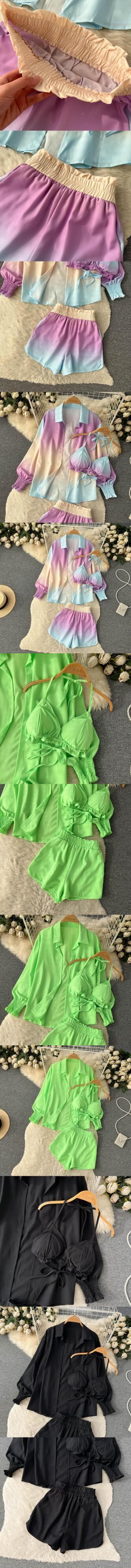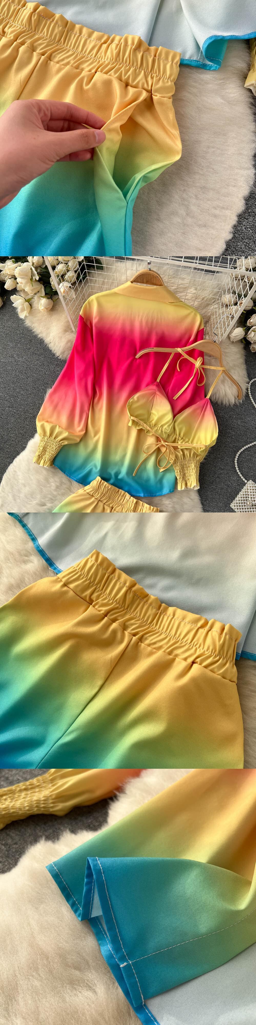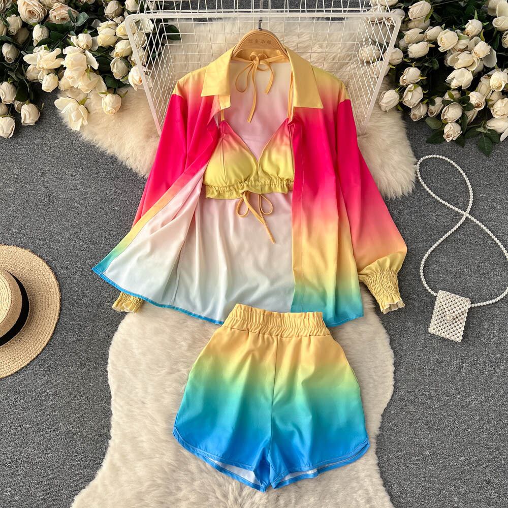 春夏セクシープリントホリデースタイルスーツレディースハンギングネックラップチェスト+長袖シャツ+ワイドレッグショーツスリーピーストレンディ ロング スプリング 春物 サマー 夏物 ブルマー lyxaj86641955658