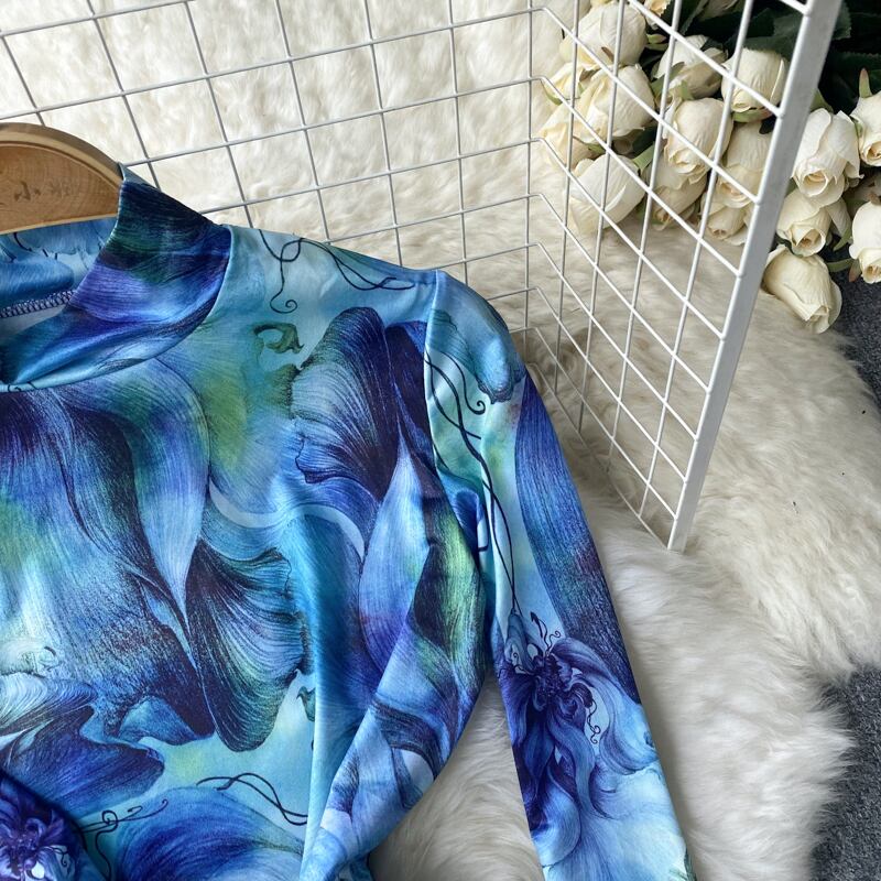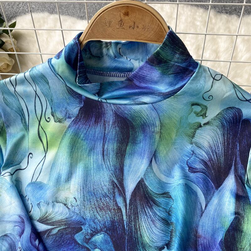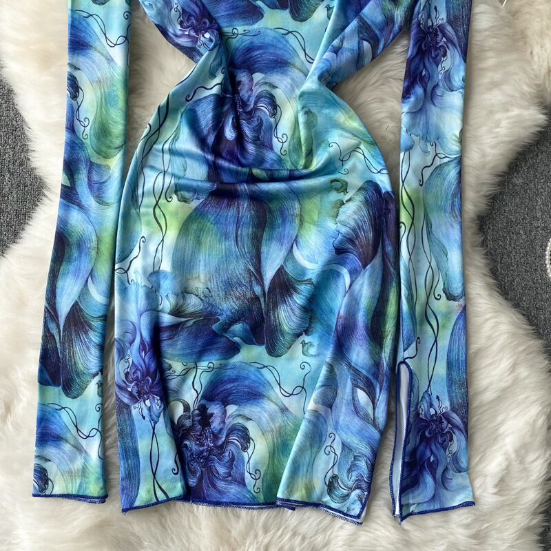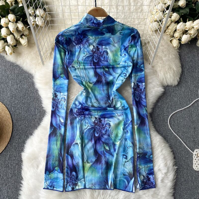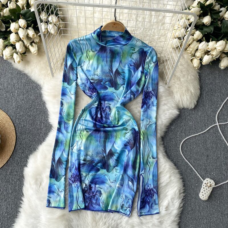 春と秋の新しい長袖のパーソナライズされたタイダイ抽象プリント スリムフィット ミッドレングス ハイネック ラップ バット ドレス ロング スプリング 春物 オータム 秋物 lyxaj56314509035