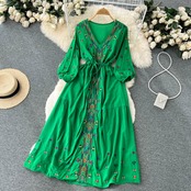 エスニック風タイウエスト痩身刺繍Vネックドレス夏の女性の海辺の休暇長袖ロングスカート潮 サマー 夏物 lyxaj87690559418