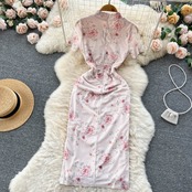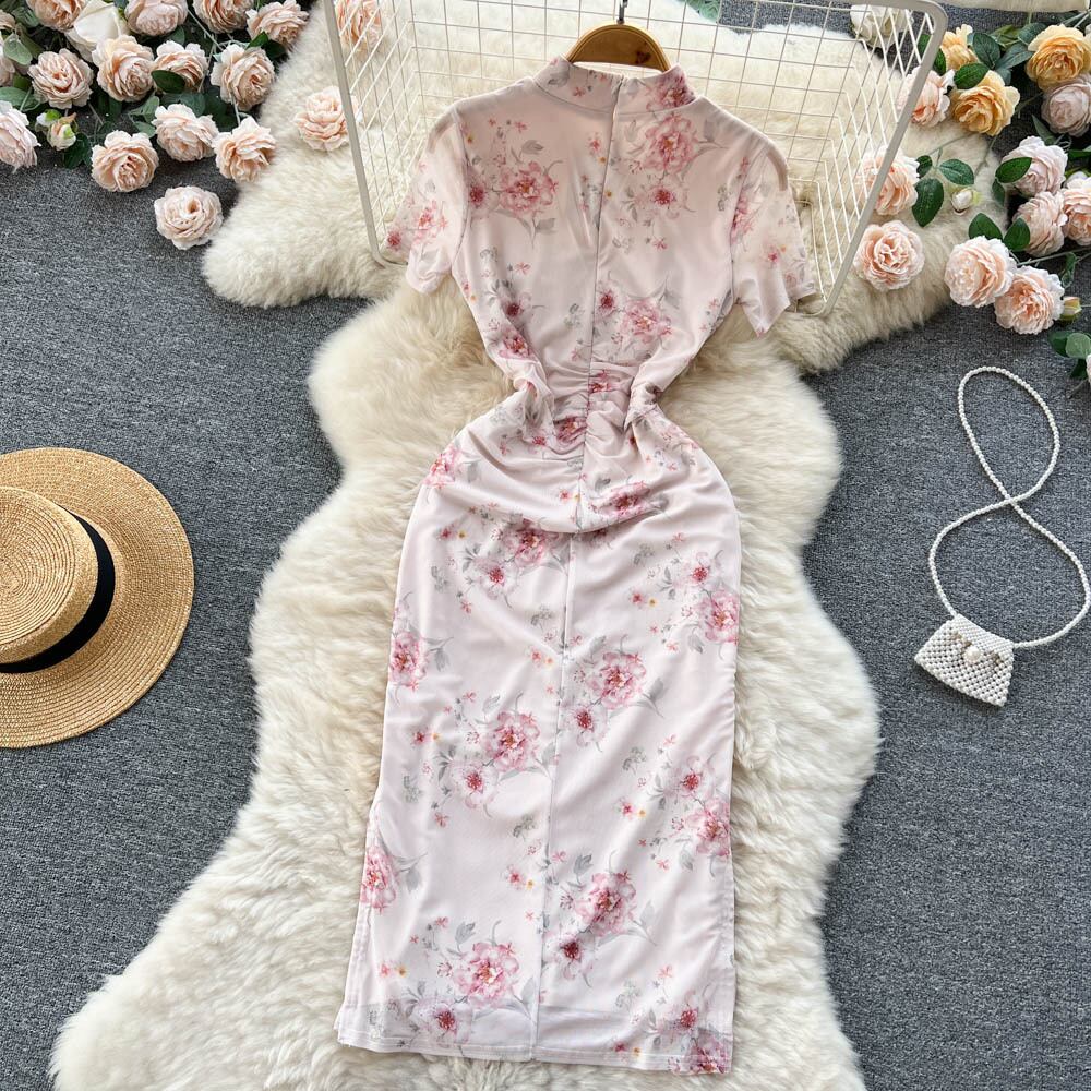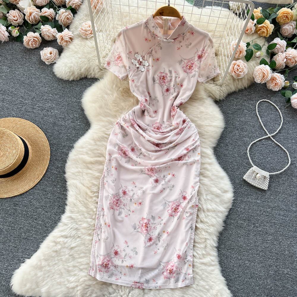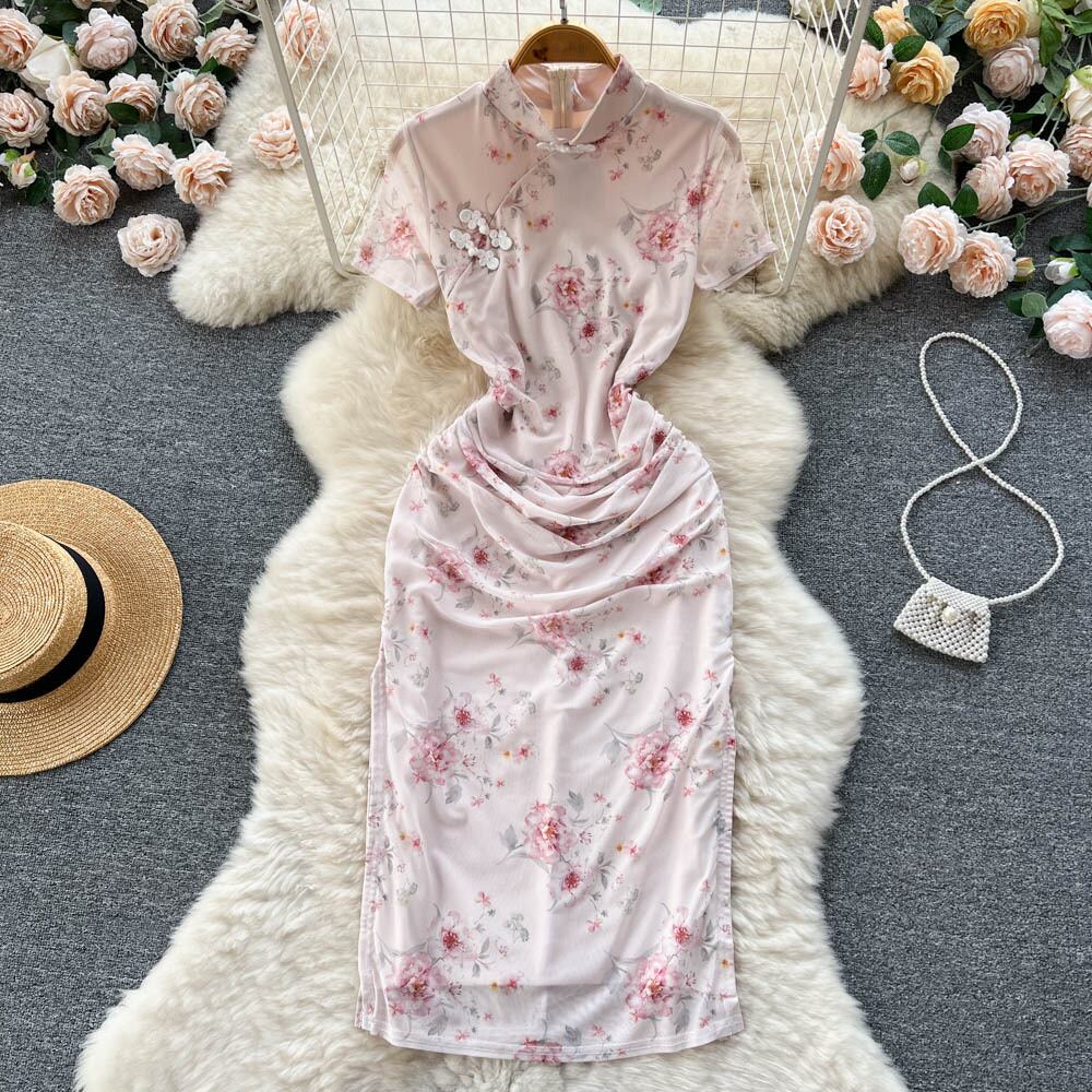 レトロ メッシュ ディスク バックル 半袖 チャイナ スタンドカラー ウエスト プリーツ レディース ハイエンド フレンチ スリット バッグ ヒップ ドレス lyxaj91802940674