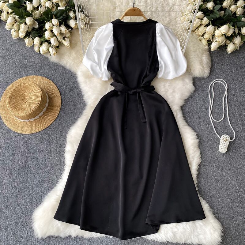 夏フレンチデザインセンスフェイクツーシックドレス女性初恋レトロ優しいヘップバーン風半袖リトルブラックドレス サマー 夏物 lyxaj807429160