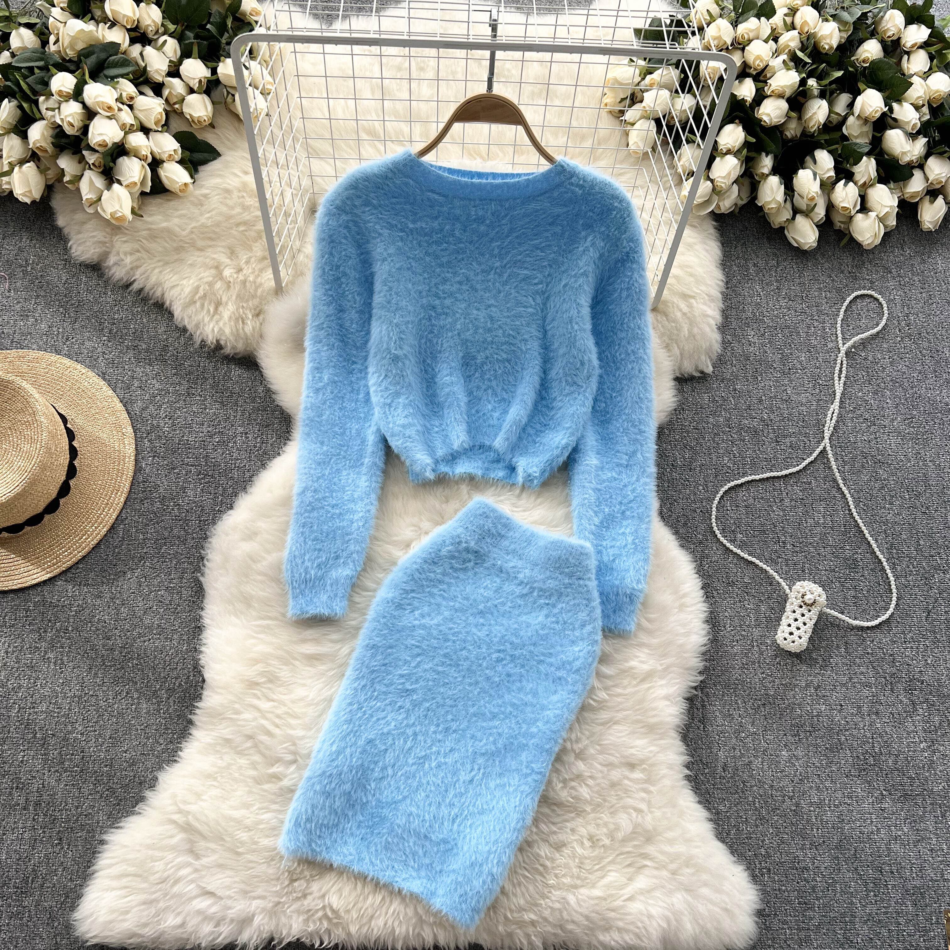 秋と冬の有名人の豪華なスーツの女性の腰の短いニットのセーター + ハイウエスト バッグ ヒップ スカート洋風 2 点セット ハイウェスト ショート オータム 秋物 ウィンター 冬物 lyxaj63260400572