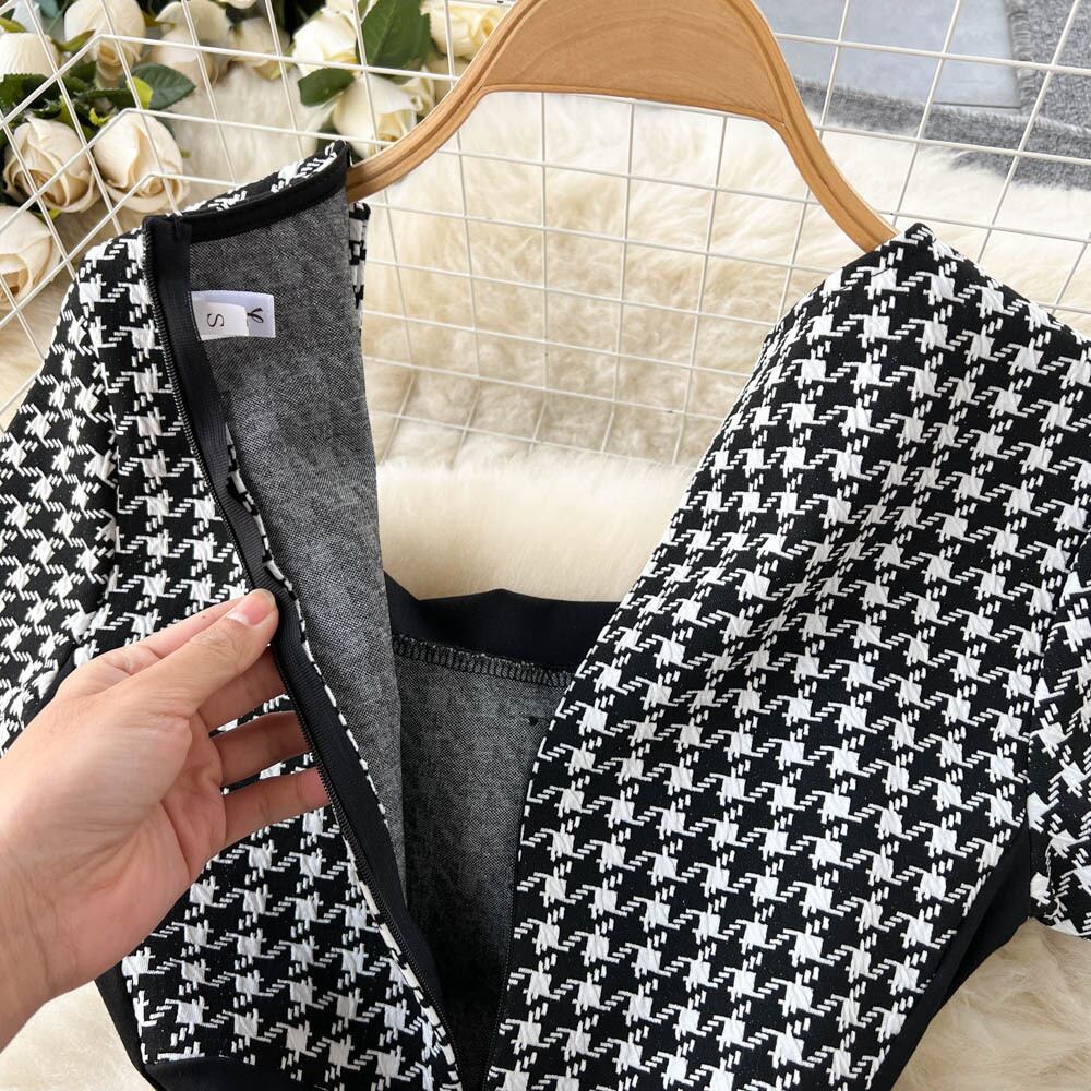 Xiaoxiangfeng フランスのレトロな千鳥格子スクエア カラー ドレス女性の夏の新しい長袖気質ウエスト バッグ ヒップ スカート ロング サマー 夏物 スクウェア lyxaj36108754683