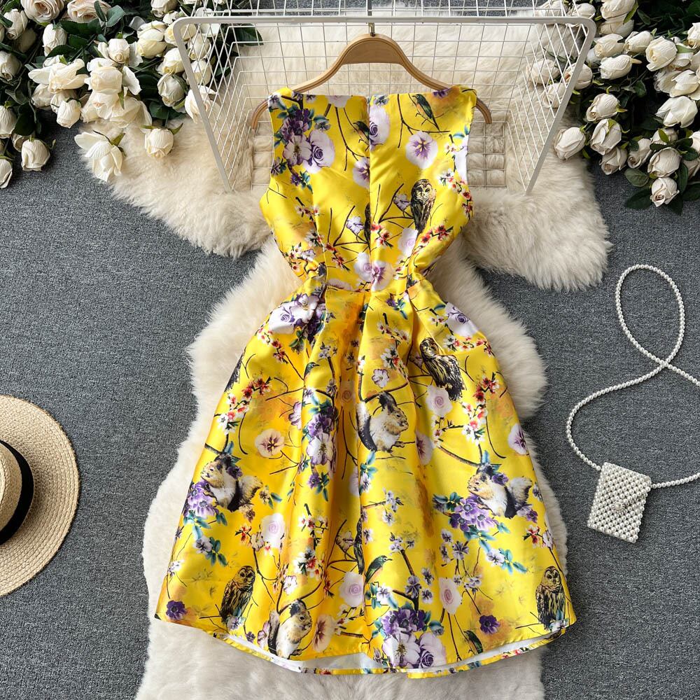 イエロー コート スタイル プリント プリンセス ドレスの女性の夏の新しいフレンチ ラウンド ネック気質ウエスト ウエスト セレブ A ライン スカート サマー 夏物 Oネック Aライン lyxaj1077380701
