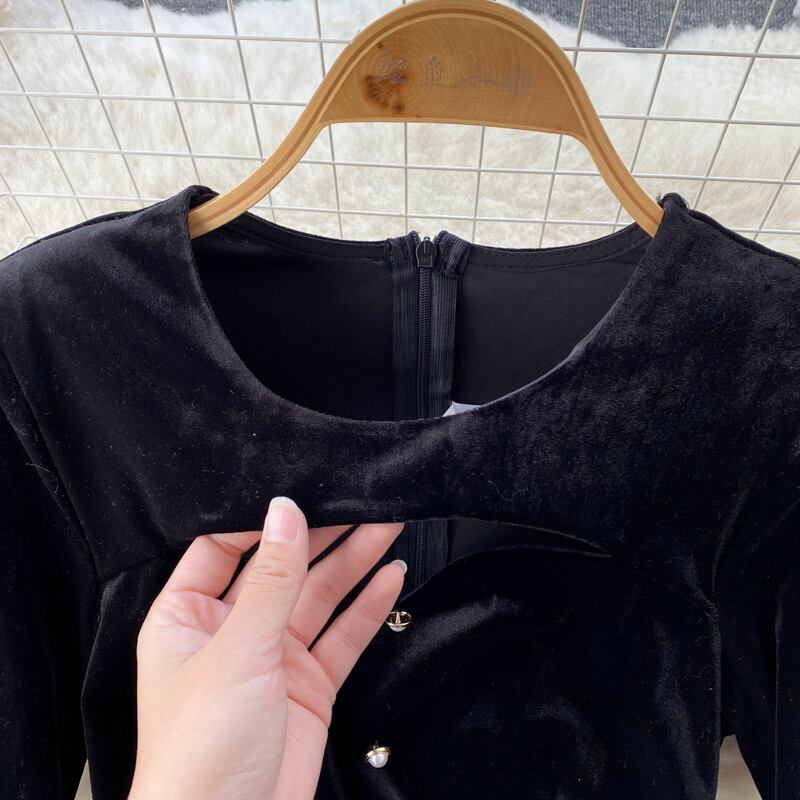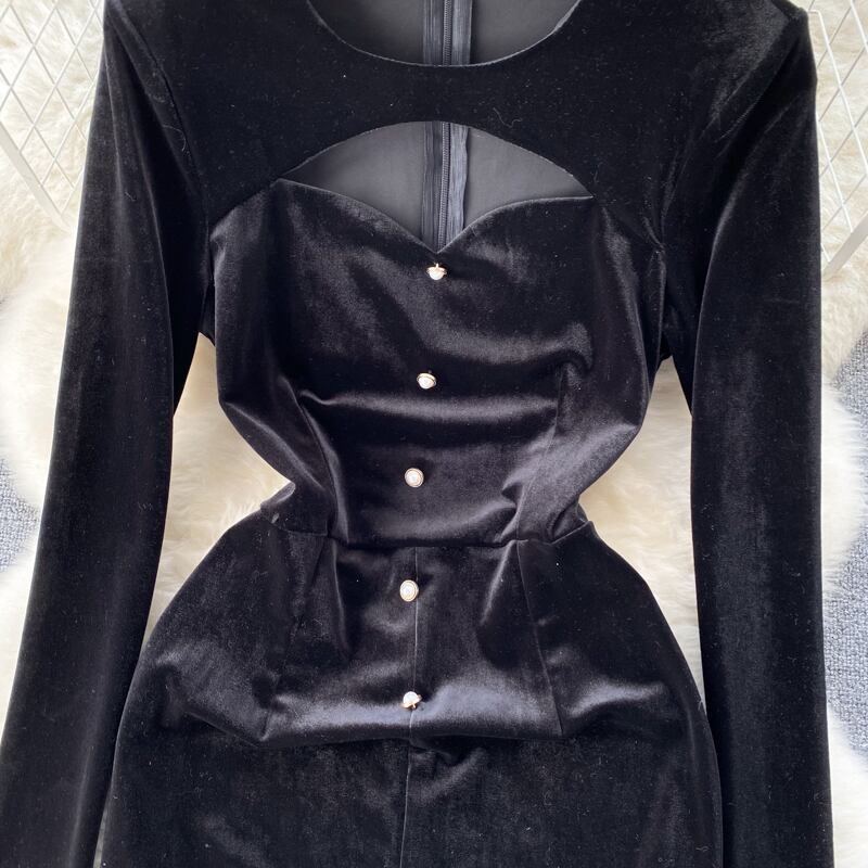 フランスの長袖の女性のスカートの女性の秋と冬のハイエンドの感覚のセクシーな中空気質の薄いスリット スカート ベルベットのドレス ロング オータム 秋物 ウィンター 冬物 lyxaj98586799144