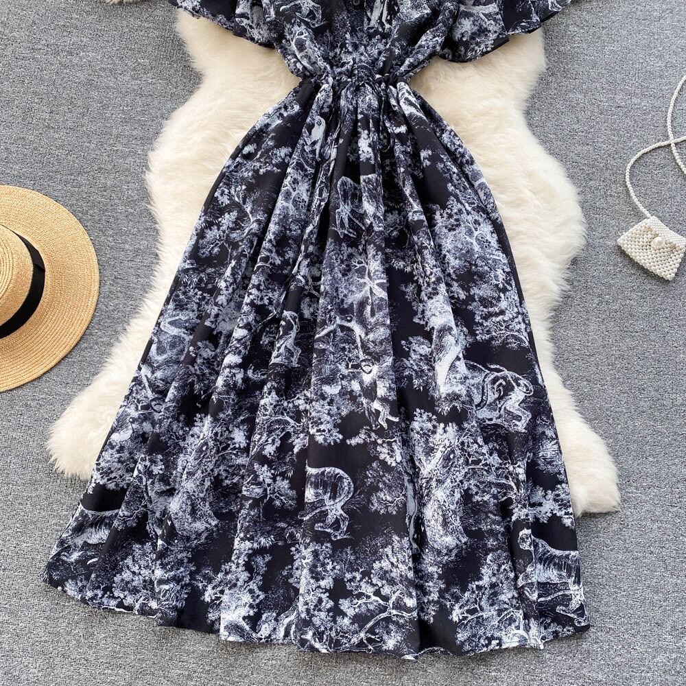 夏フレンチレトロプラティコドン長袖ウエスト痩身プリーツ花柄ドレス女性ルーズビッグスイング膝丈ロングスカート サマー 夏物 lyxaj22284677347