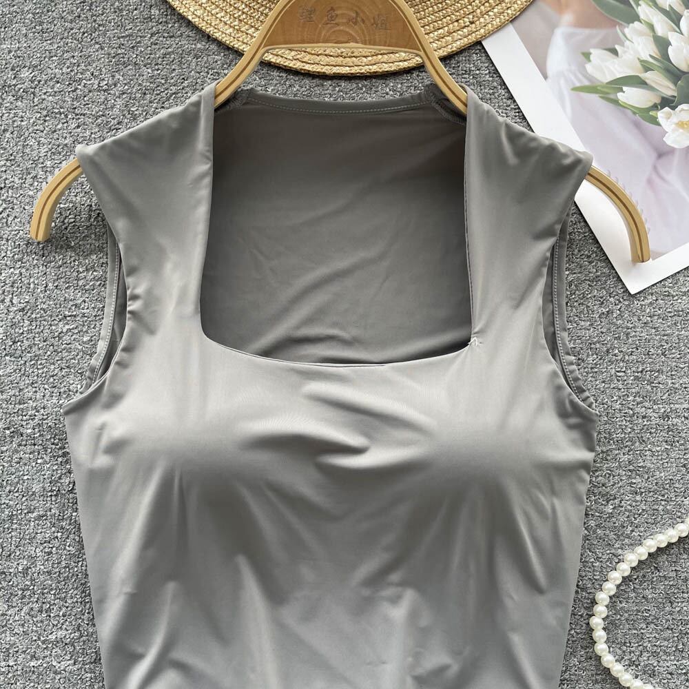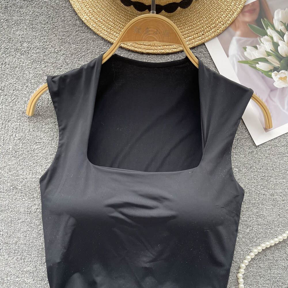 美しい背中スクエア ネック マシン鎖骨ノースリーブ ベスト胸パッド女性無地ニッチ セクシーなショート ボトムス シャツ ソリッドカラー スクウェア lyxaj64998621414