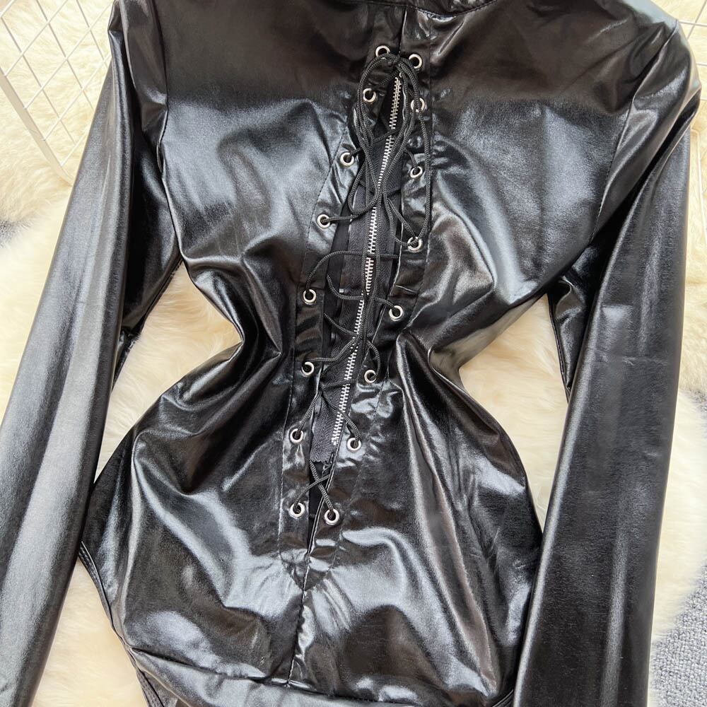 秋と冬の新しい巾着ネクタイ ハーフ ハイ カラー長袖ベイビー ヨーロッパとアメリカのスキニー PU レザー ハイ k セクシーなジャンプスーツ女性の潮 ロング オータム 秋物 ウィンター 冬物 ヨーロピアン lyxaj43892797308