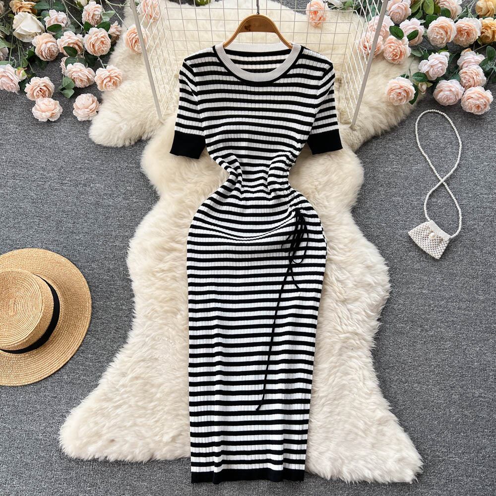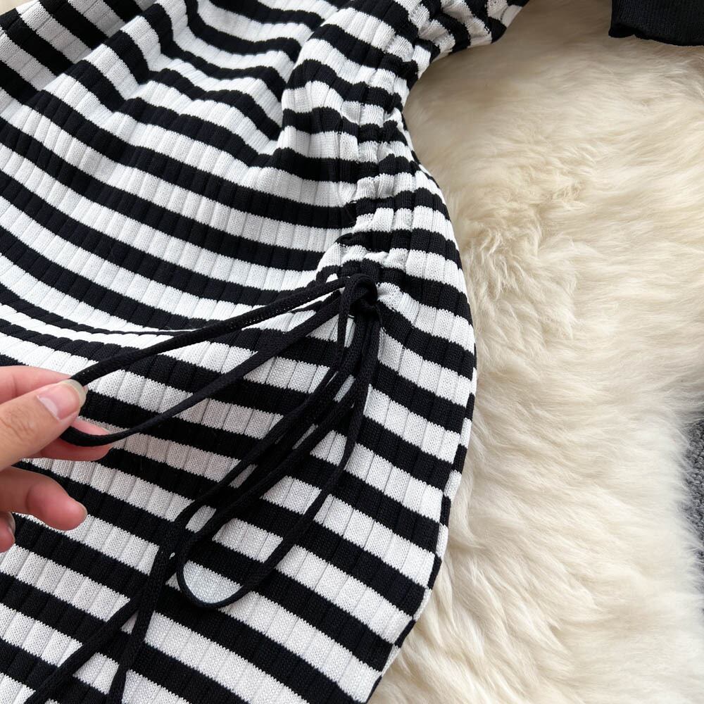 弾性ストライプニット半袖ドレス女性の初秋新作底入れロングスカート巾着デザインスカート エラスティック 伸縮 オータム 秋物 lyxaj37272478506