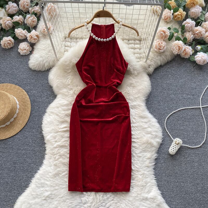 2022 新セレブデザインファッションパールハンギングネックセクシーなスリットスリムフィットヒップベルベットドレス 真珠 lyxaj58780252791