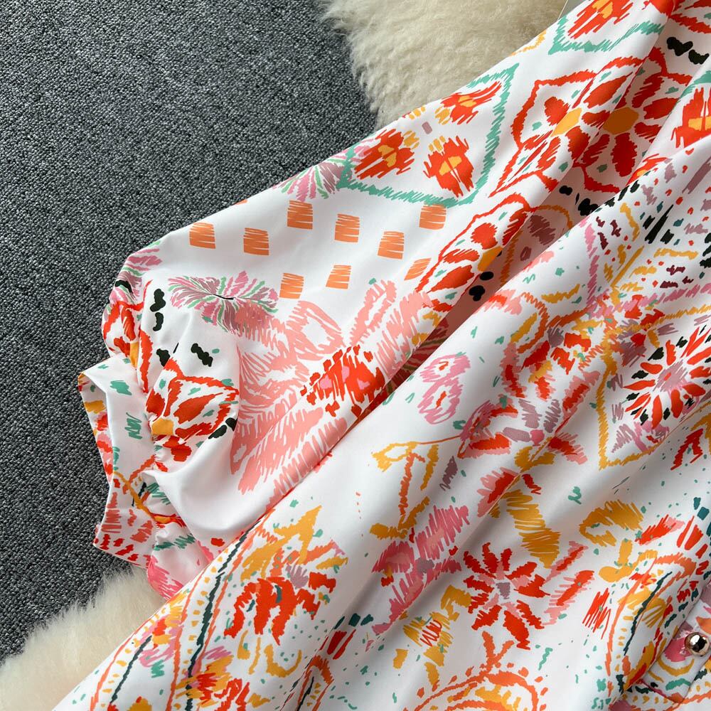 秋の新裁判所スタイルシングルブレストプリントラウンドネックドレス女性ファッショントランペットスリーブルーズ A ライン人形スカート オータム 秋物 Oネック Aライン lyxaj8670426938