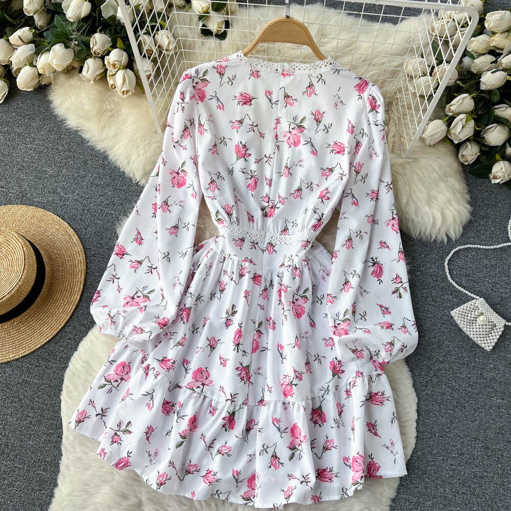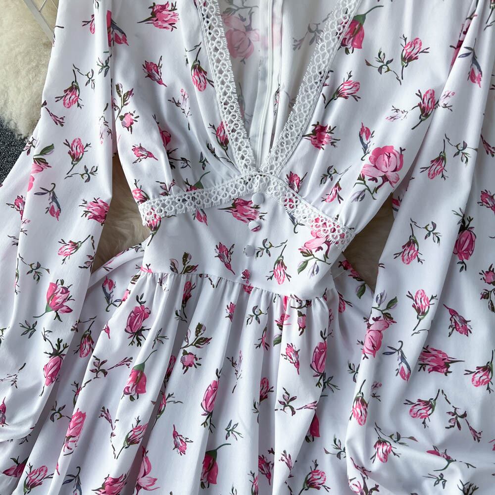 春新作 ランタンスリーブ レース 深いVネック 花柄デザイン センスニッチなAライン スイートフェアリーワンピース 大人ガーリー スウィート キュート カジュアル スプリング 春物 lyxaj58709537858
