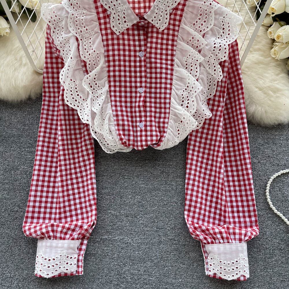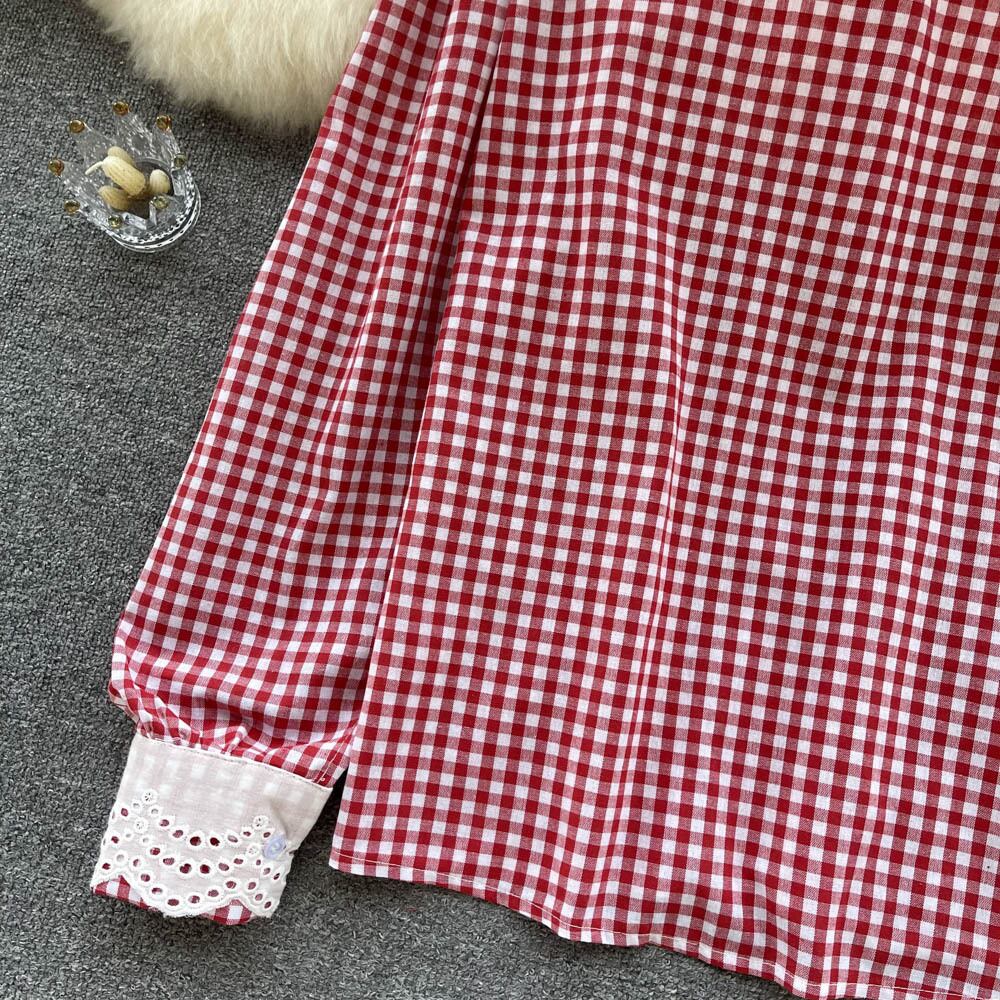 シックな春の新菌レースレースステッチ eign スタイルラペルスリムパフスリーブチェックシャツトレンディ スプリング 春物 lyxaj9329357726