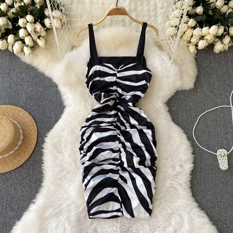 ヨーロッパとアメリカのイン スタイルのセクシーな弾性プリーツ スリム ストラップ ドレス女性の高品質ストライプ プリント バッグ ヒップ スカート エラスティック 伸縮 ヨーロピアン lyxaj15855590004