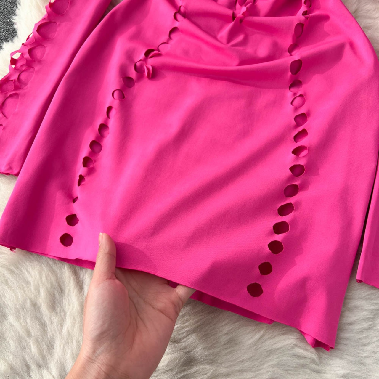 ヨーロッパとアメリカの新しいイン スタイル無地セクシーな中空長袖ラウンド ネック ミッドレングス ウエスト痩身ヒップ ドレス トレンディ ロング Oネック ソリッドカラー ヨーロピアン lyxaj76748315041