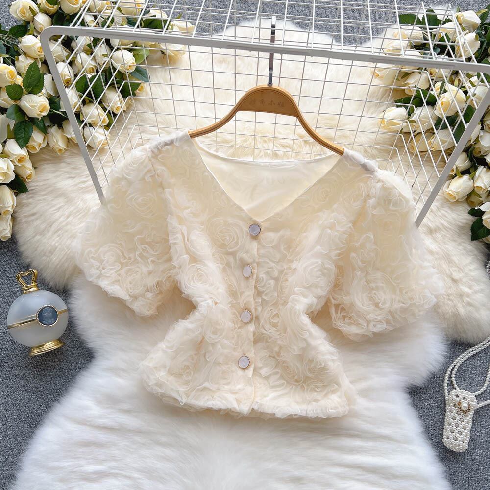 フレンチスウィートメッシュフラワー気質シャツレディースデザインセンスニッチVネックシングルブレストボタンショートオールマッチトップトレンディ 大人ガーリー キュート カジュアル フラワーデザイン lyxaj65060484419