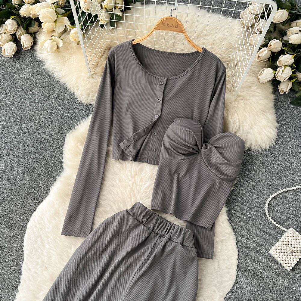 秋の新作カジュアルセレブ無地スーツレディースショートチェストラップ+長袖カーディガン+ドレープワイドレッグパンツ3点セット ロング オータム 秋物 ソリッドカラー lyxaj75275512712