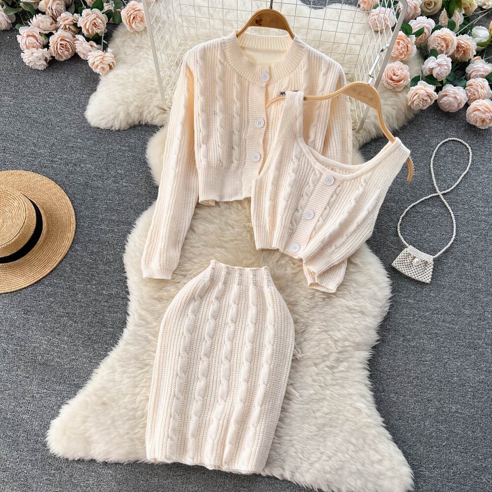 セレブ気質の優しい風スリーピース スーツ女性セーター カーディガン ジャケット小さなキャミソール ハイ ウエスト スカート トレンディ ハイウェスト lyxaj35986852493
