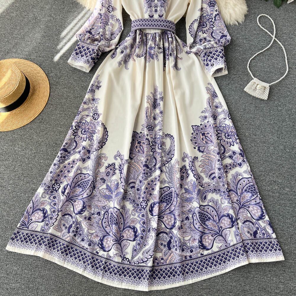 春と秋の宮殿スタイルのレトロエンドのドレスの女性の腰を細くするシングルブレストのビッグスイングオーバーザニープリントロングスカート レース スプリング 春物 オータム 秋物 lyxaj62307152555