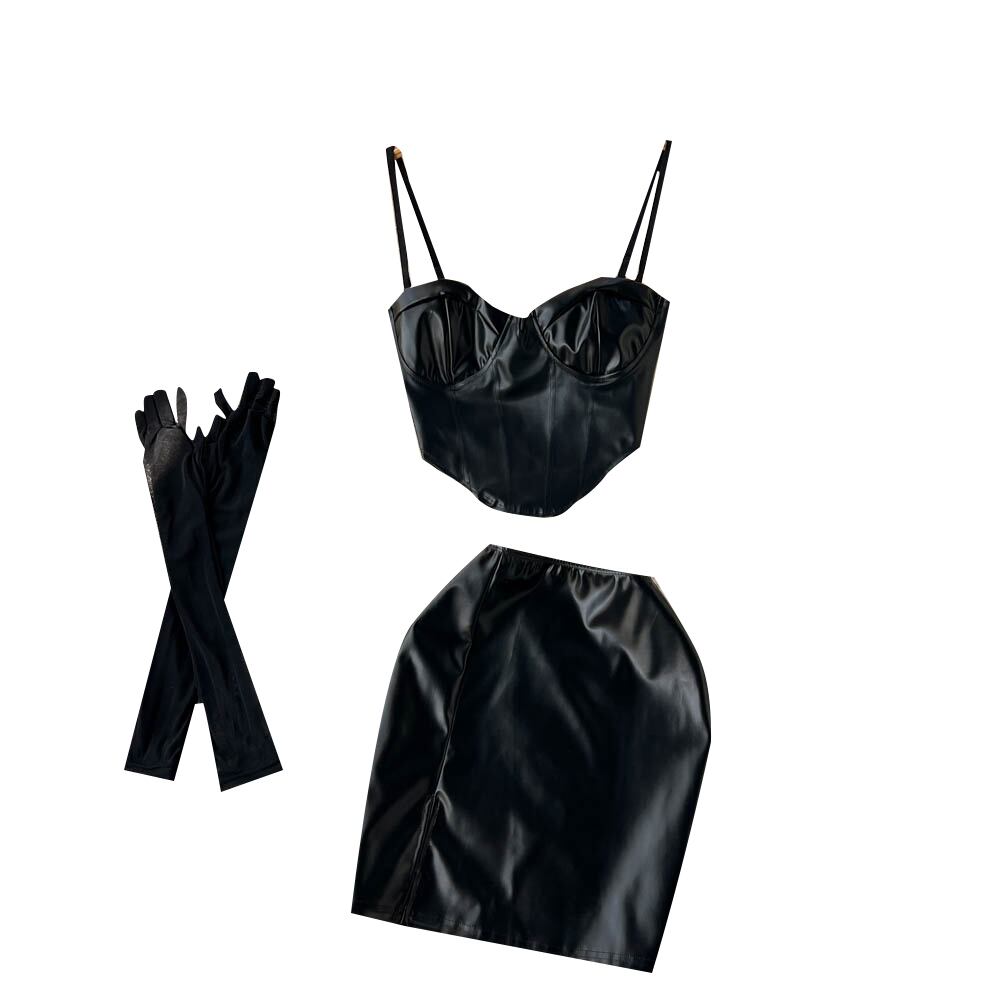 春と秋のレトロな PU レザー スパイス ガールズ スーツ ショート イレギュラー ベスト サスペンダー + ヒップ ショート スカート 2 点セット スプリング 春物 オータム 秋物 lyxaj34524257799